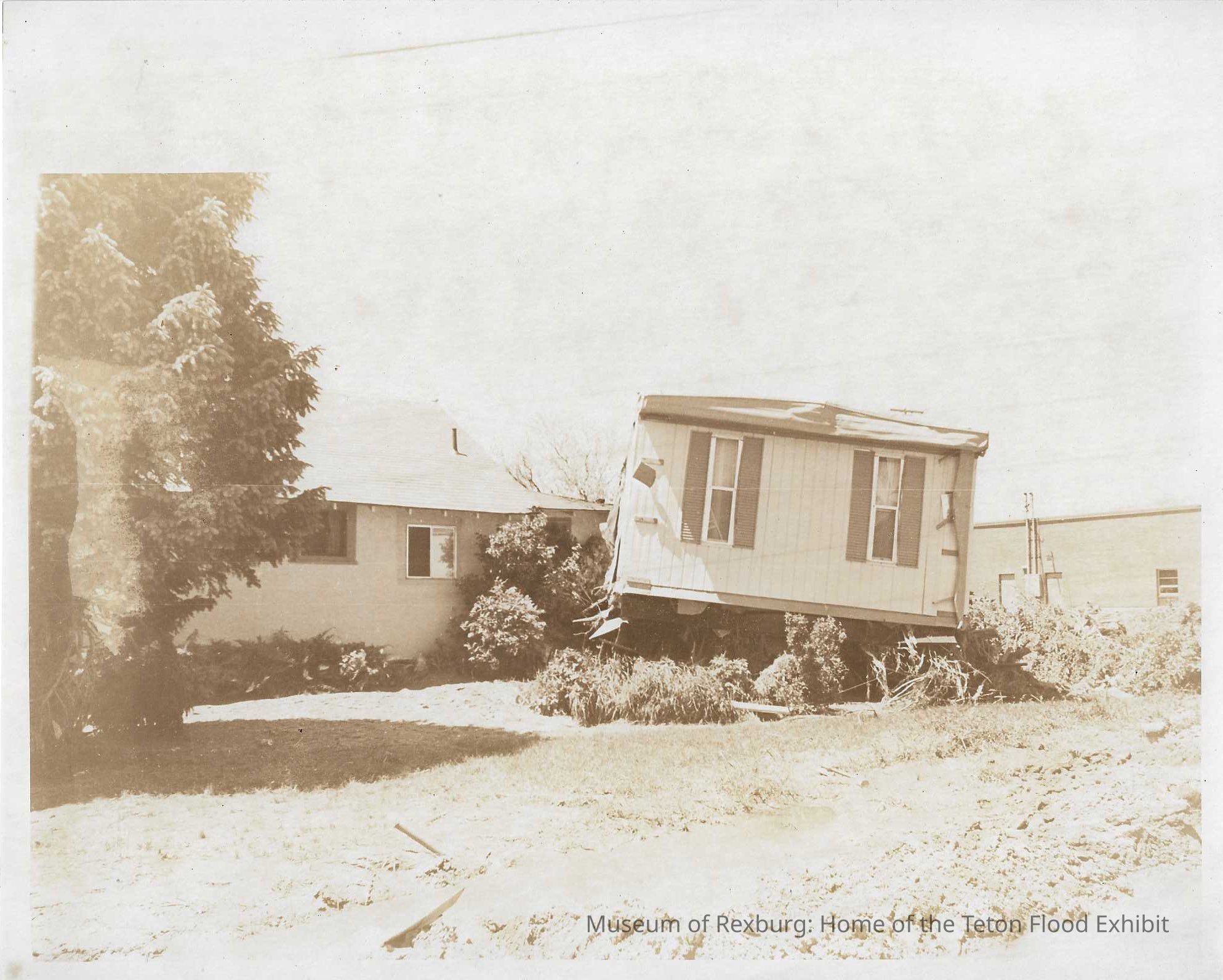 This photo was contained in a brown envelope with "Thanks Dave Gautes" written in cursive on it. The photo was taken in black and white but looks like it was over exposed. The subject matter however, is still visible. The subject of the photo is a trailer home that was picked up by the flood waters and shifted around. In the photo the home is resting on debris, and some shrubbery. The dimensions of the photo are *" X 11". This photo comes from the old Standard Journal Warehouse located at 23 S 1st E.