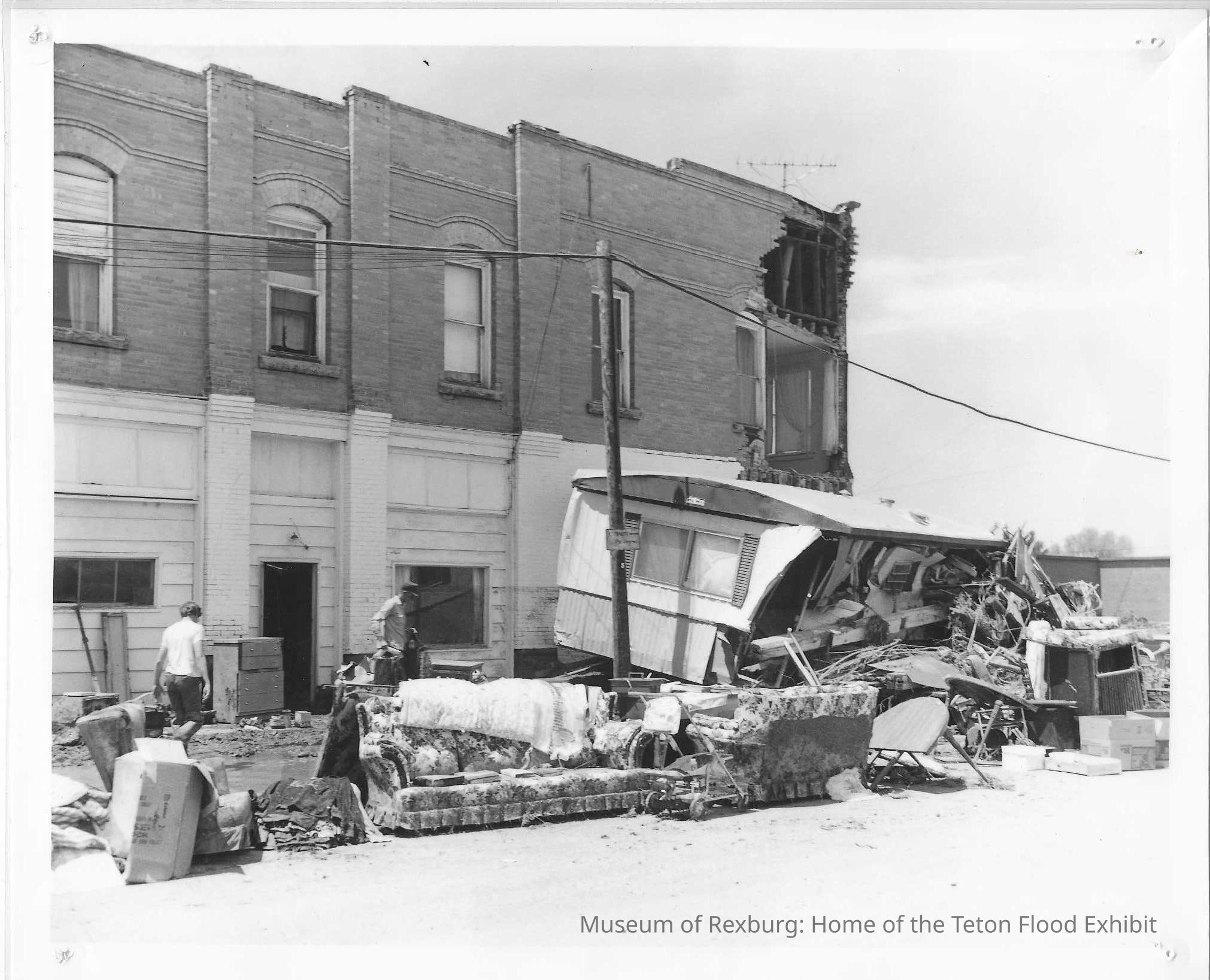 This black and white photo is laminated and is 8x10 inches. It shows a trailer house that has hit a building in an unknown area. The building has a large corner taken out of it. There are two men in the photo as well. There is a large amount of debris and household items scattered around. The words At the height of the flood, the trailer house rammed the top of the of the building it is now under are written below the photo.