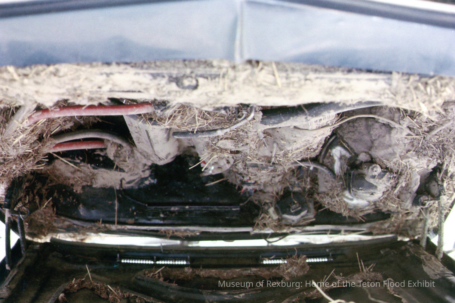 This photo was taken in colour. The subject of the photo is the under portion of the Car Bonnet. The car was swept up with the flood currents. The car is filled with mud, grass, and other foliage debris. The dimensions of the photo are 6" X 4".