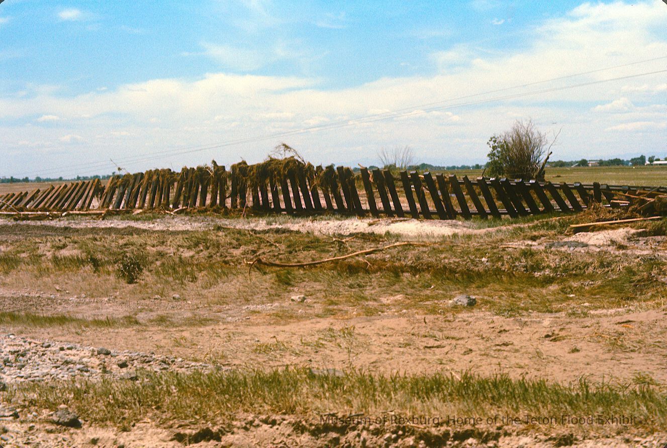 The photo was taken in colour. The subject of the photo is an uprooted train track. The foreground of the shot is a field with spotty grass, a the blue sky speckled with wispy clouds. The tracks themselves were uprooted so much they look like a fence used to corral live stock. he photo is a part of a digital collection donated to the museum by Rick Davis.