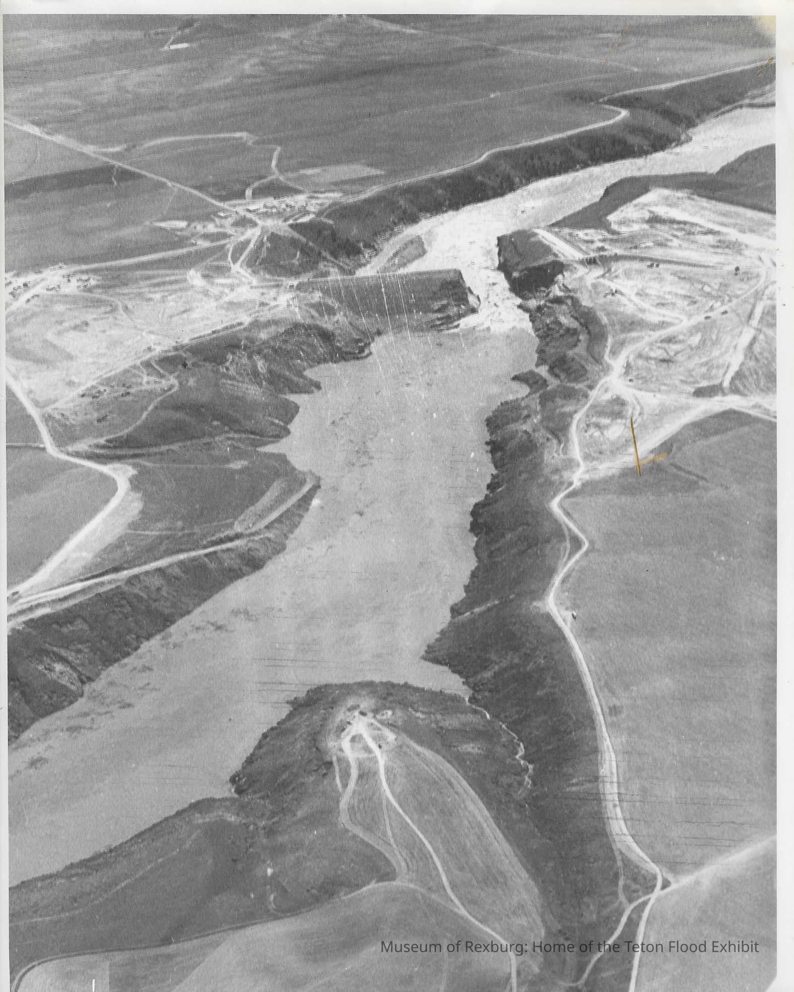 This photo is black and white and shows the Teton Dam as the reservoir is emptying through the large section to the right of the dam. We can also see all the water headed down the Teton canyon. We can also see the many roads that the engineers used to build the dam in this photo. This photo is 10 x 8 inches big. This photo comes from the old Standard Journal Warehouse located at 23 S 1st E.
