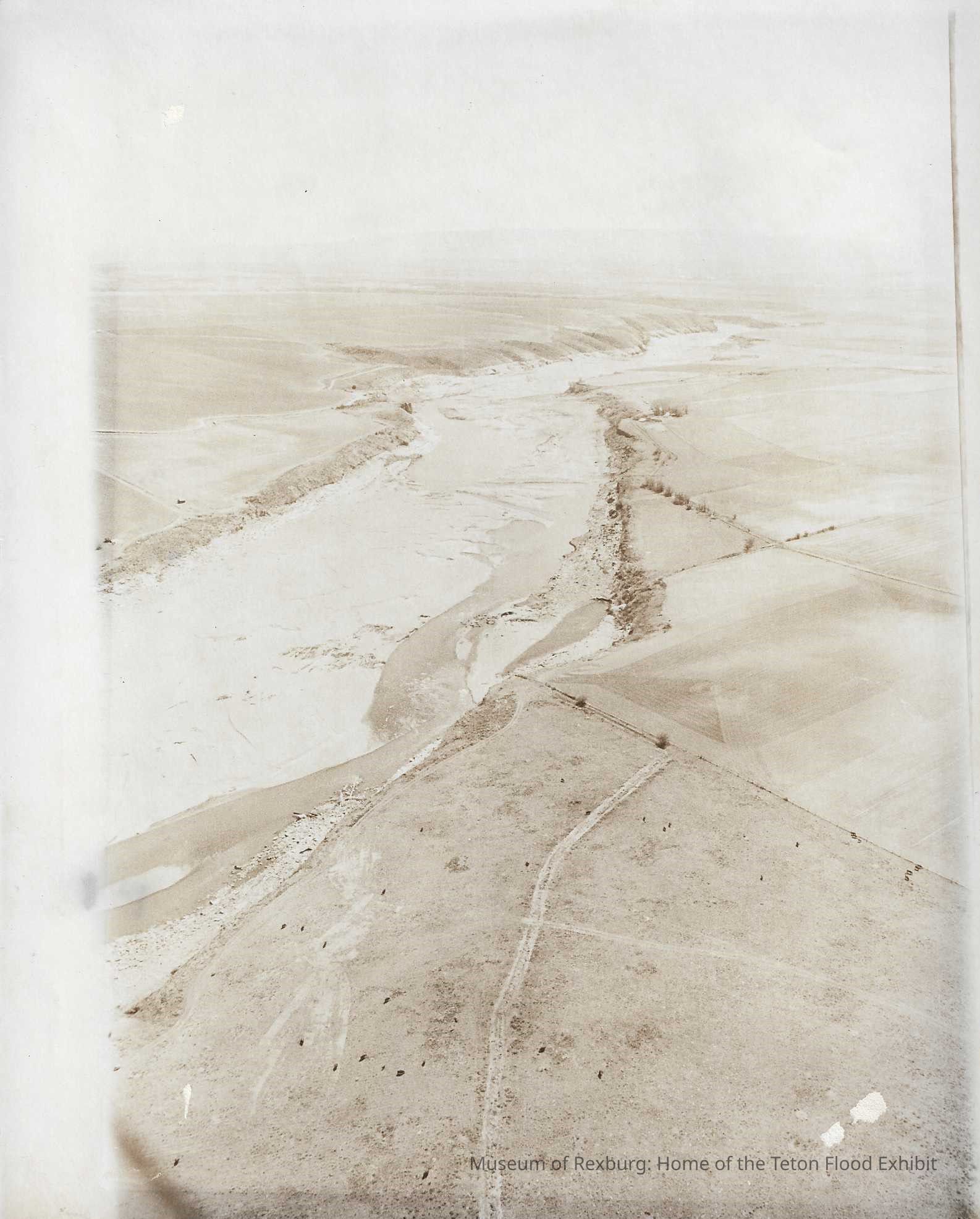 This photo is black and white and shows the water as it is rushing down the Teton Canyon. This photo is 10 x 8 inches big. This photo could be possibly when the waters were receding and the dam was almost empty. It is difficult to tell in this photo. This photo comes from the old Standard Journal Warehouse located at 23 S 1st E.