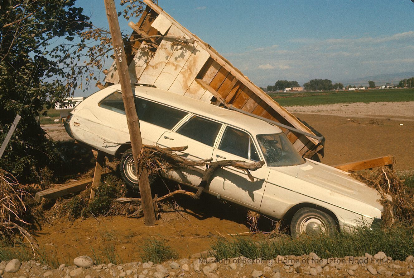 This photo was taken in colour. The subject of the photo is a white hatchback and a small shed that became victims of the rancorous flood. The white car has a cracked windshield, but is otherwise unscarred by its' tumultuous move from its' previous position. Behind the white hatchback is a dilapidated shed that was stricken from its' foundation and driven by the flood to the current location. The shed appears to have at one point a white finish to it, however, many of the exterior planks have been torn off from the shed. The shed and the automobile are resting on a pile of debris, where the bonnet of the car is tipped downward into a small ravine. The photo is a part of a digital collection donated to the museum by Rick Davis.