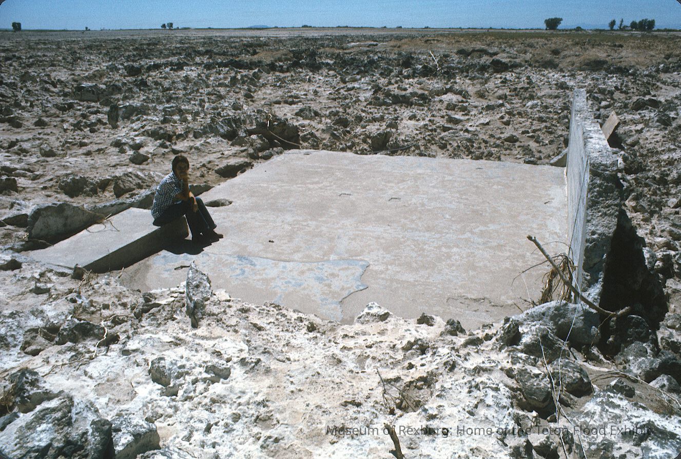 The photo was taken in colour. It is assumed that the photo was taken during the day prior to the sun setting. The photo depicts the remains of the Wilford area. After the ravenous flood water tore the Wilford area asunder. The subject of the photo is a foundation with only half of a single wall standing. On the right hand side of the photo there is a person sitting on a cement raise on the foundation. Around them is grey rock and debris. The photo is a part of a digital collection donated to the museum by Rick Davis.
