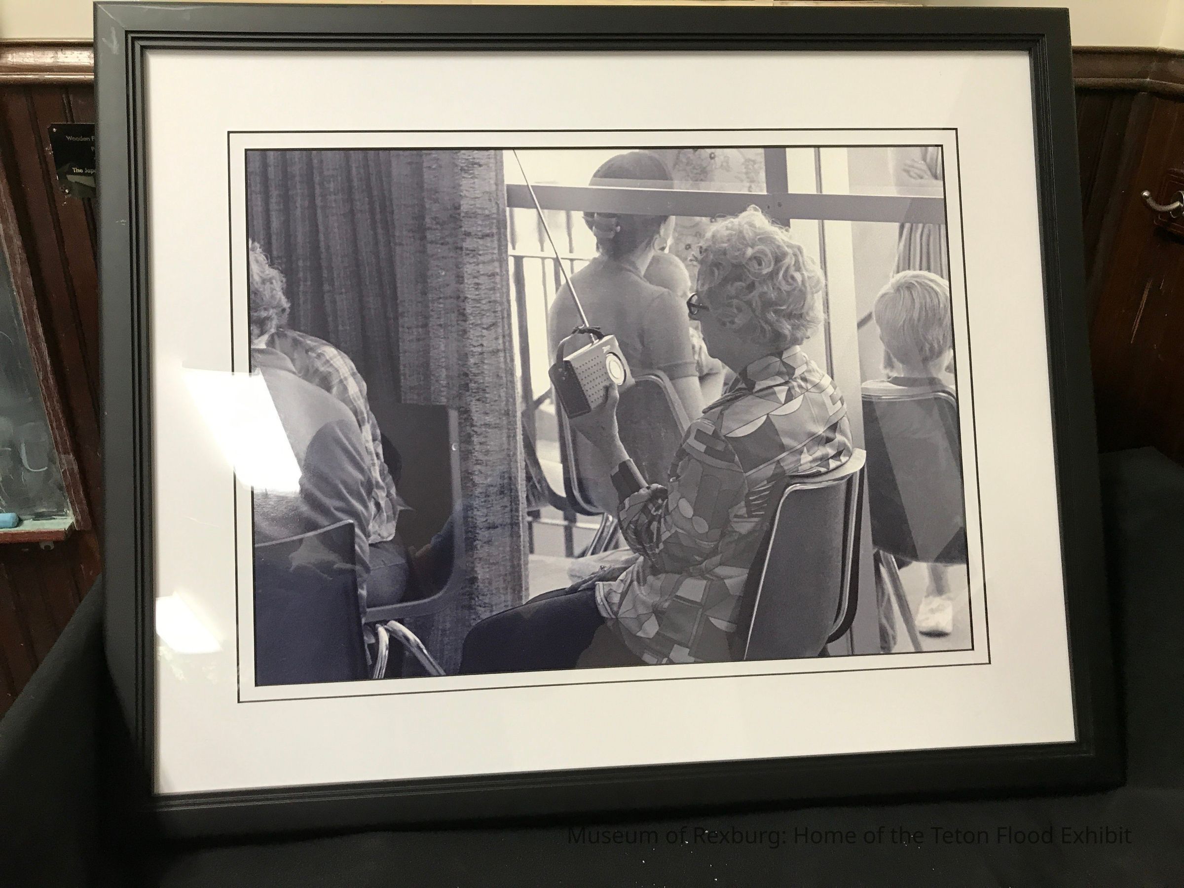This photo is black and white and shows an elderly woman sitting in a chair holding a radio in her left hand. She is wearing a shirt that has many geometric shapes on it. This photo is apart of the Teton Flood Display and is hanging in the flood room. This photo is in a frame that is black and the photo has a white border around it. This photo is 26 x 31 inches big.
