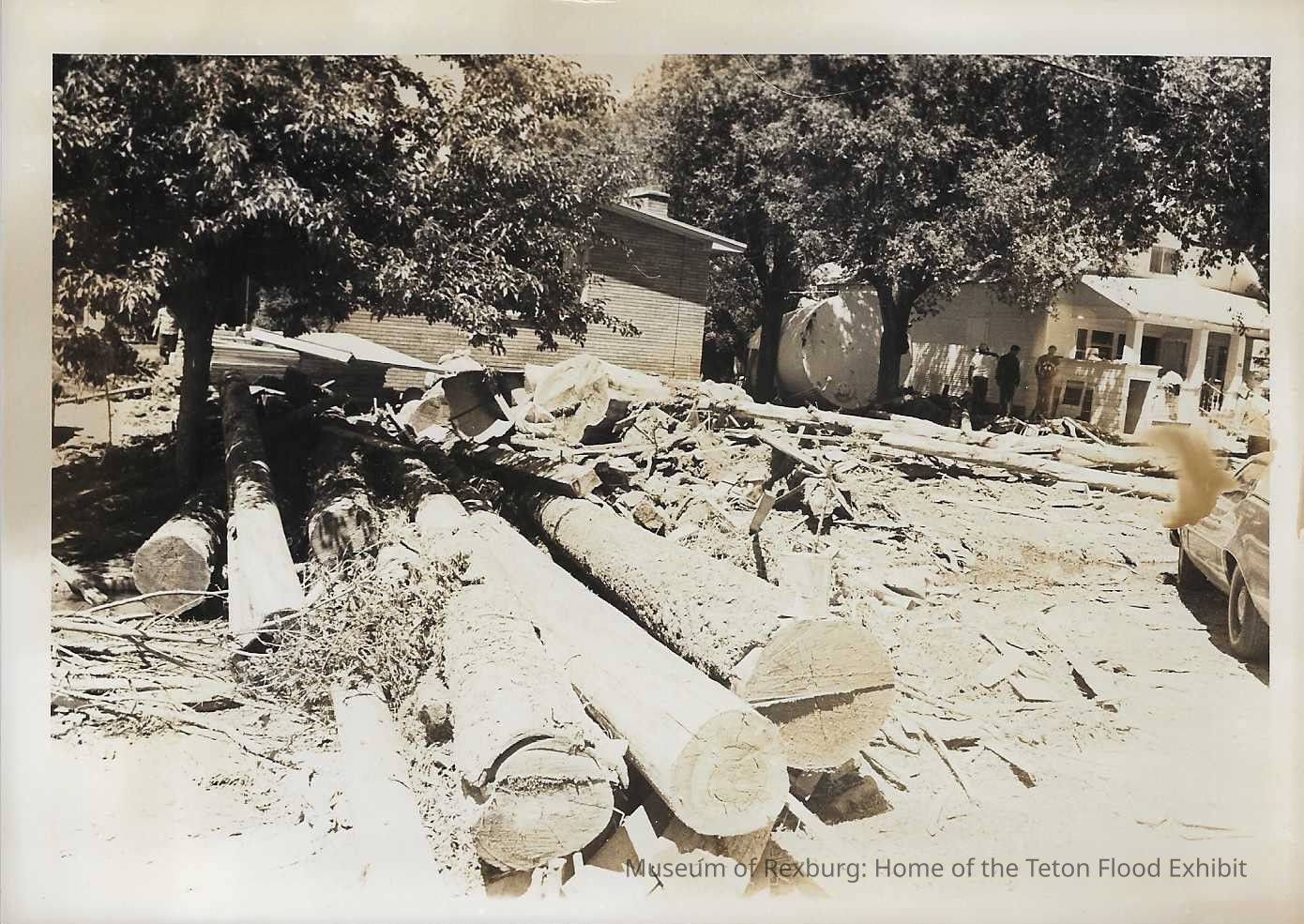This photo is in colour and shows a pile of logs sitting underneath a tree along with other wooden type pieces of debris. We can see a white home to the right of the photo along with a car. This photo is 5 x 7 inches big. This photo comes from the old Standard Journal Warehouse located at 23 S 1st E.