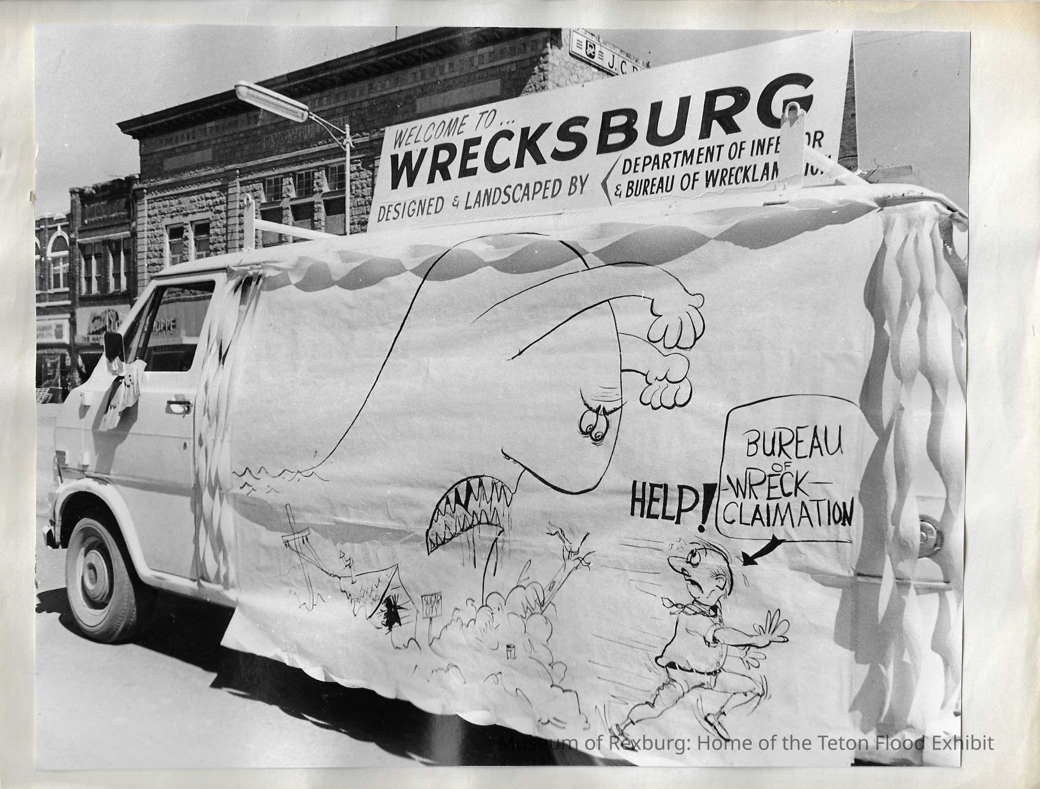 This photo is black and white and shows a white van with a sign that reads, "WELCOME TO... WRECKSBURG DESIGNED & LANDSCAPED BY DEPARTMENT OF INFERIOR & BUREAU OF WRECKLAMATION". The sign on the van shows a large angry looking wave that is headed to get what appears to be a man that works for the "BUREAU OF WRECKCLAMATION". This photo is 8 x 10.5 inches big. This photo comes from the old Standard Journal Warehouse located at 23 S 1st E.