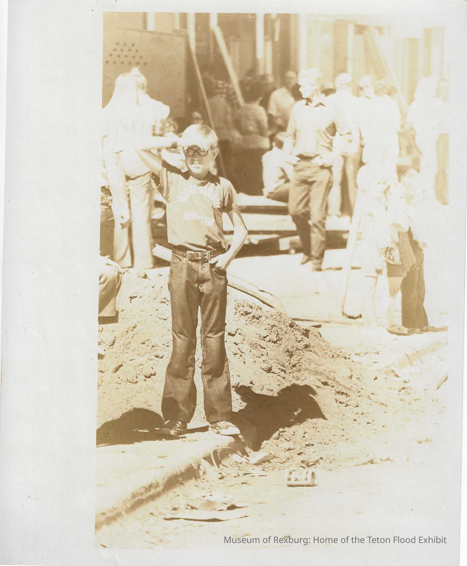 The photo was contained in a brown envelope with "Thanks Dave Gauts" Written in cursive on it. The photo was taken in black and white, however was over exposed, giving it a sepia colour. The subject of the photo is a young boy with his hand cupped over his eyes to block out the sun He is wearing glasses, a short sleeved shirt that is tucked into his jeans, and a belt around his jeans. He is standing on the side walk in front of a pile of dirt and mud. In the background people are shifting about and standing in queue. The dimensions of the photo are 11" X 8". This photo comes from the old Standard Journal Warehouse located at 23 S 1st E.