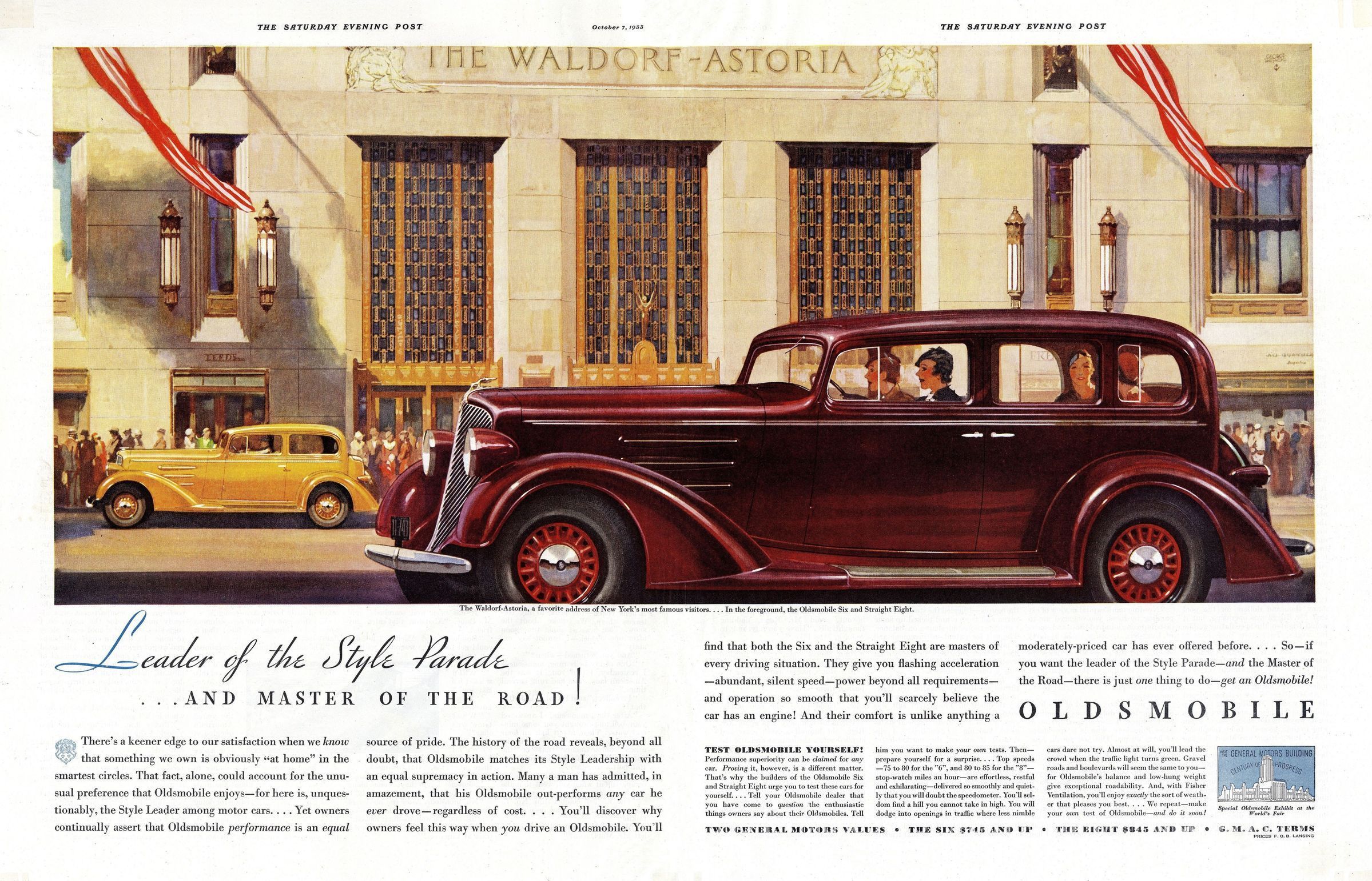 There's a keener edge to our satisfaction when we know that something we own is obviously "at home" in the smartest circles. That fact, alone, could account for the unusual preference that Oldsmobile enjoys - for here is, unquestionably, the Style Leader among motor cars.... Yet owners continually assert that Oldsmobile performance is an equal source of pride. The history of the road reveals, beyond all doubt, that Oldsmobile matches its Style Leadership with an equal supremacy in action. Many a man has admitted, in amazement, that his Oldsmobile out-performs any car he ever drove-regardless of cost... You'll discover why owners feel this way when you drive an Oldsmobile. You'll find that both the Six and the Straight Eight are masters of every driving situation. They give you flashing acceleration - abundant, silent speed - power beyond all requirements - and operation so smooth that you'll scarcely believe the car has an engine! And their comfort is unlike anything a moderately-priced car has ever offered before.... So - if you want the leader of the Style Parade - and the Master of the Road - there is just one thing to do - get an Oldsmobile!