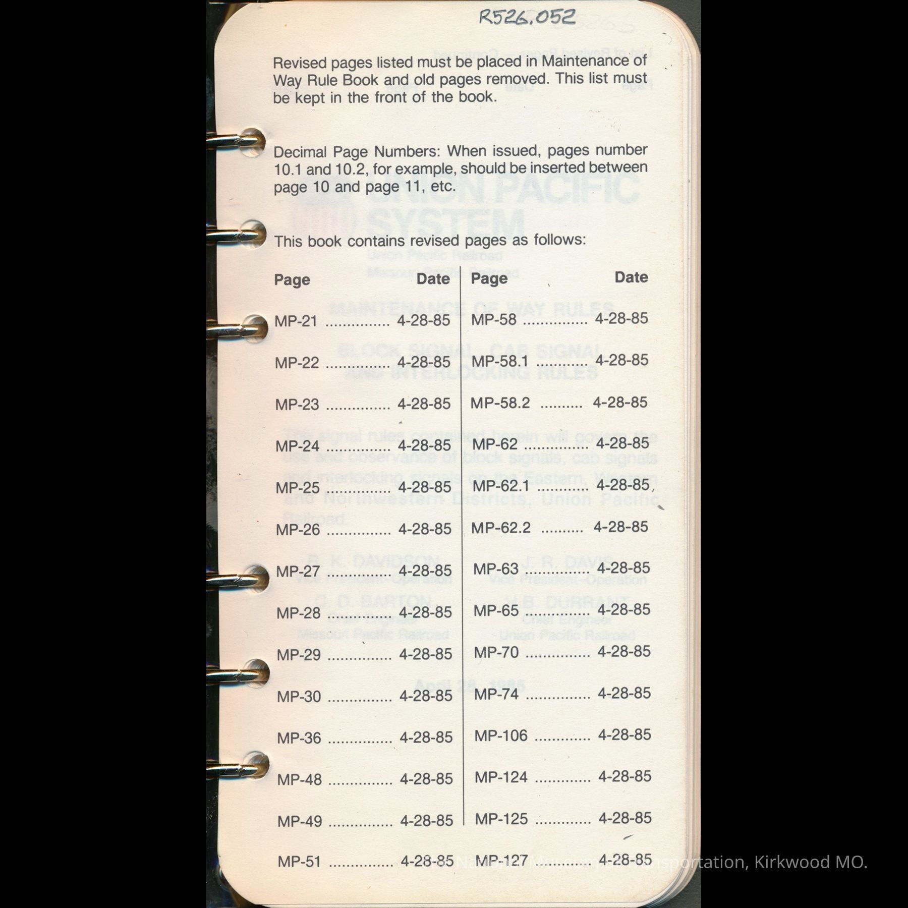 Maintenance of Way Rules. Effective April 28, 1985.Entry/Object ID