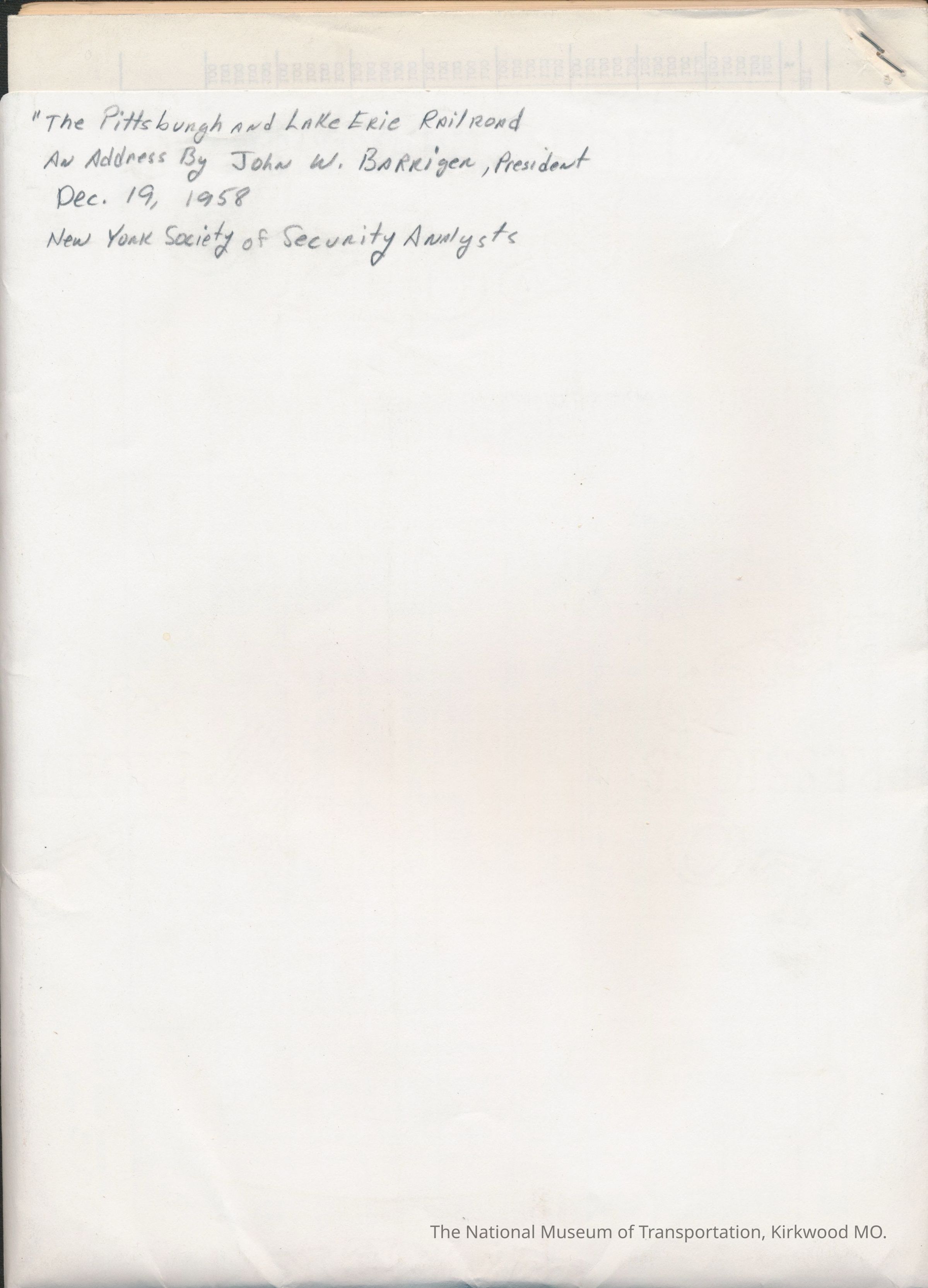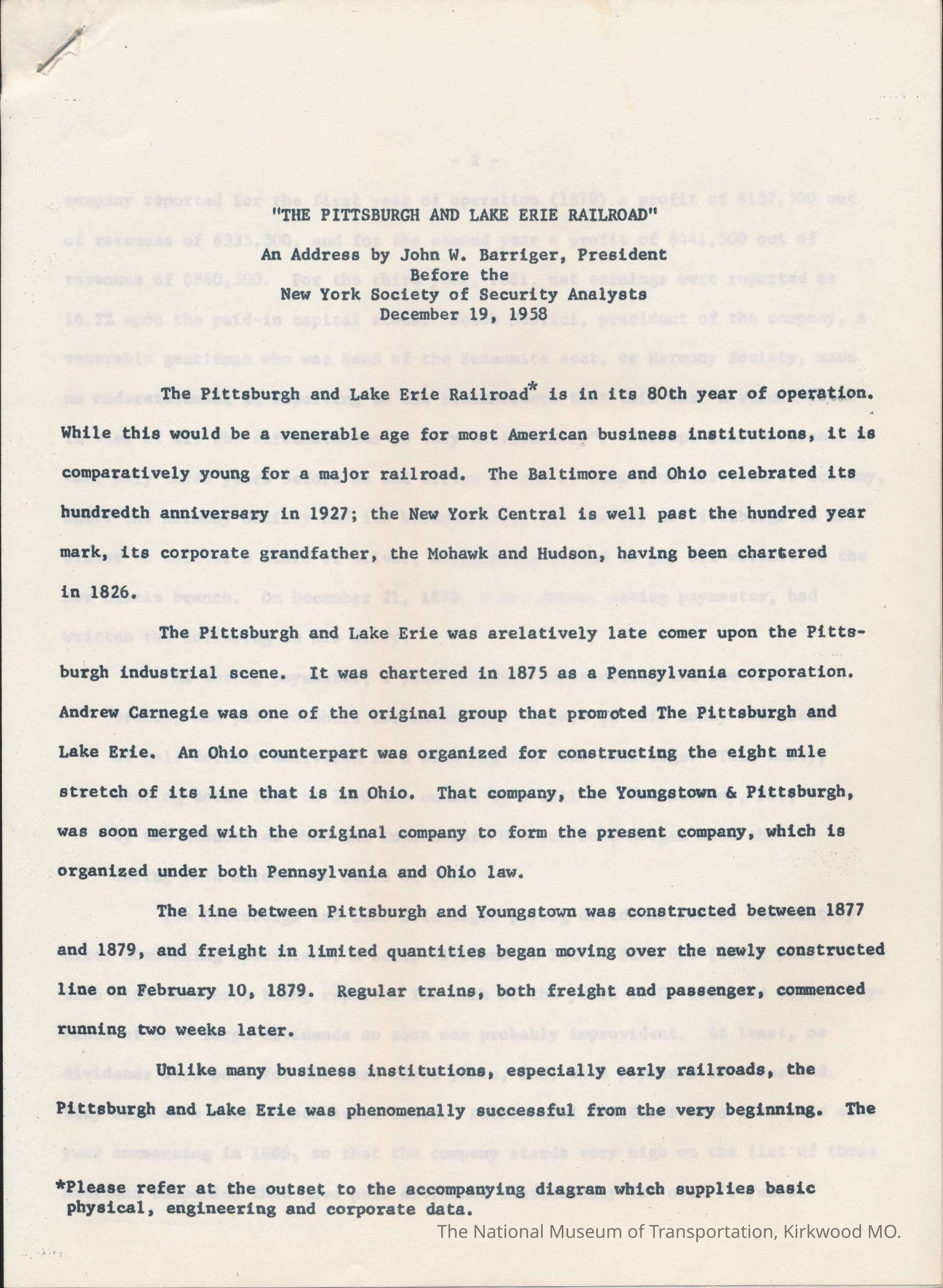 Pittsburgh and Lake Erie Railroad, The. An address by John W. Barriger.Entry/Object ID