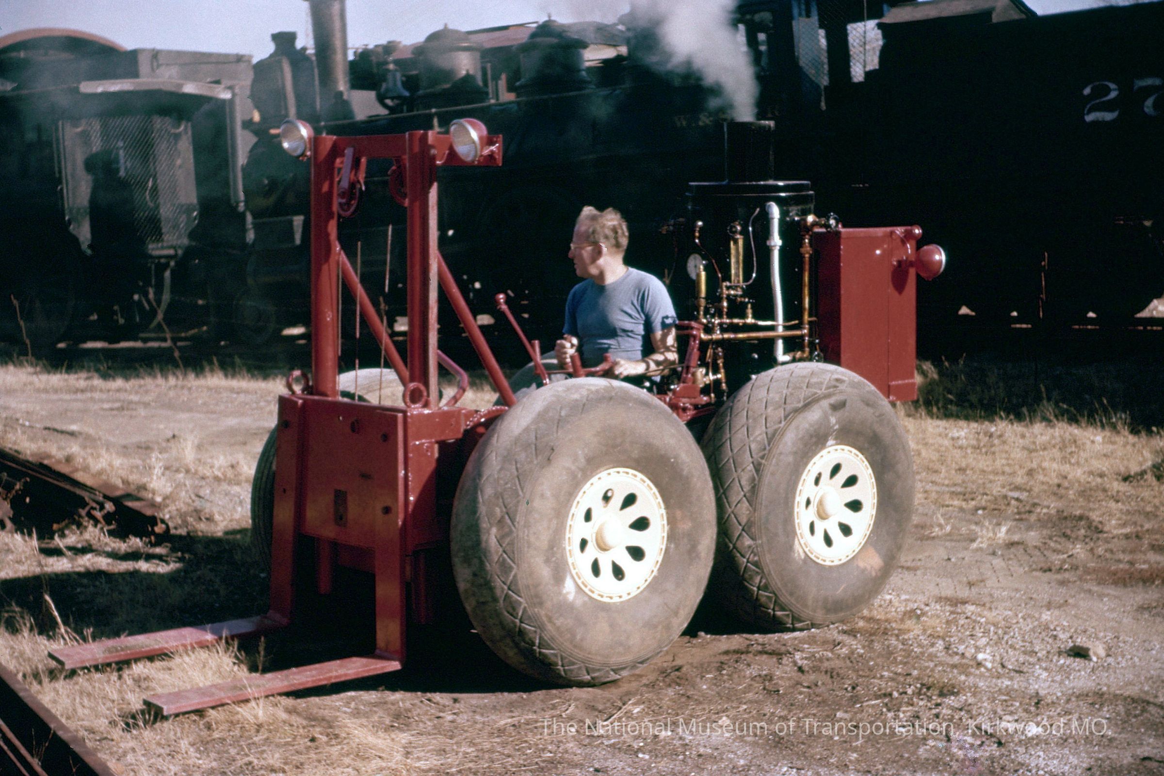 Fred Semple driving the Locomobile engine-powered lift.Subject Person or Organization