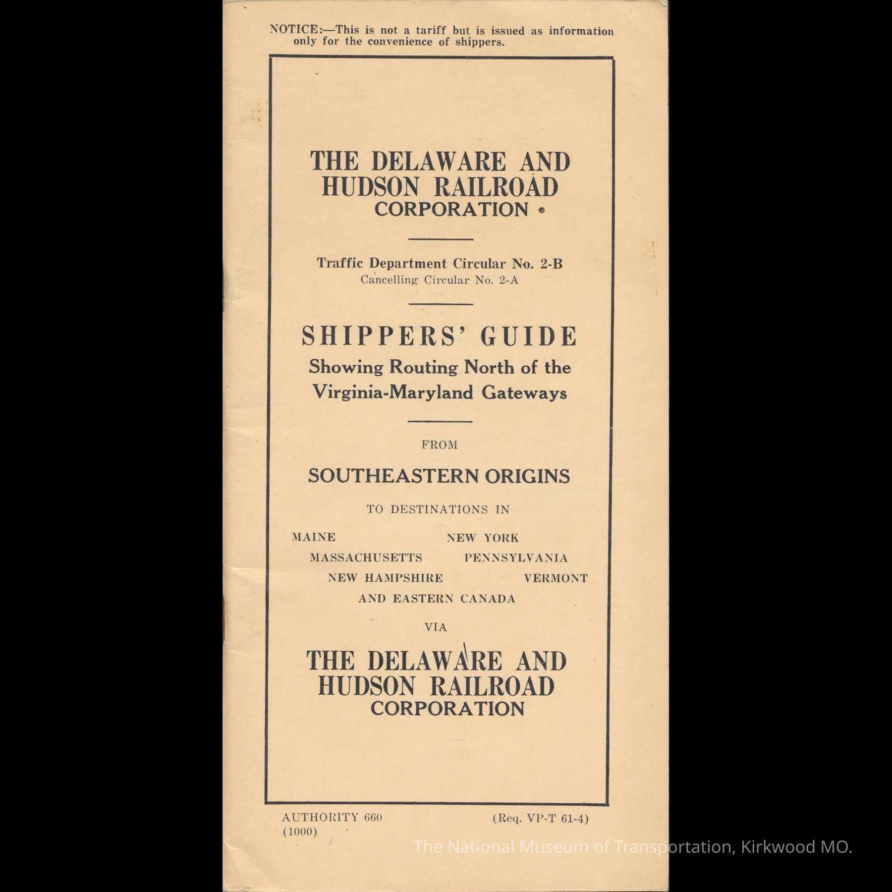 from Southeastern Origins to Destinations in Maine, Massachusetts, New Hampshire, New York, Pennsylvania, Vermont and Eastern Canada via The Delaware and Hudson Railroad Corporation.Collection