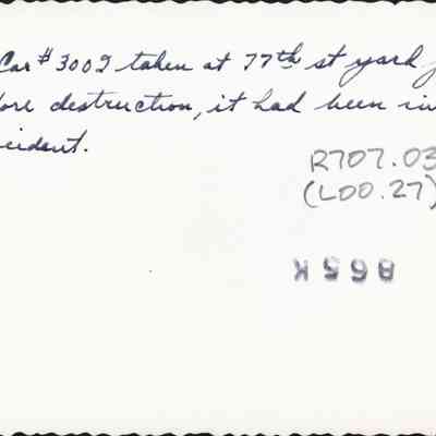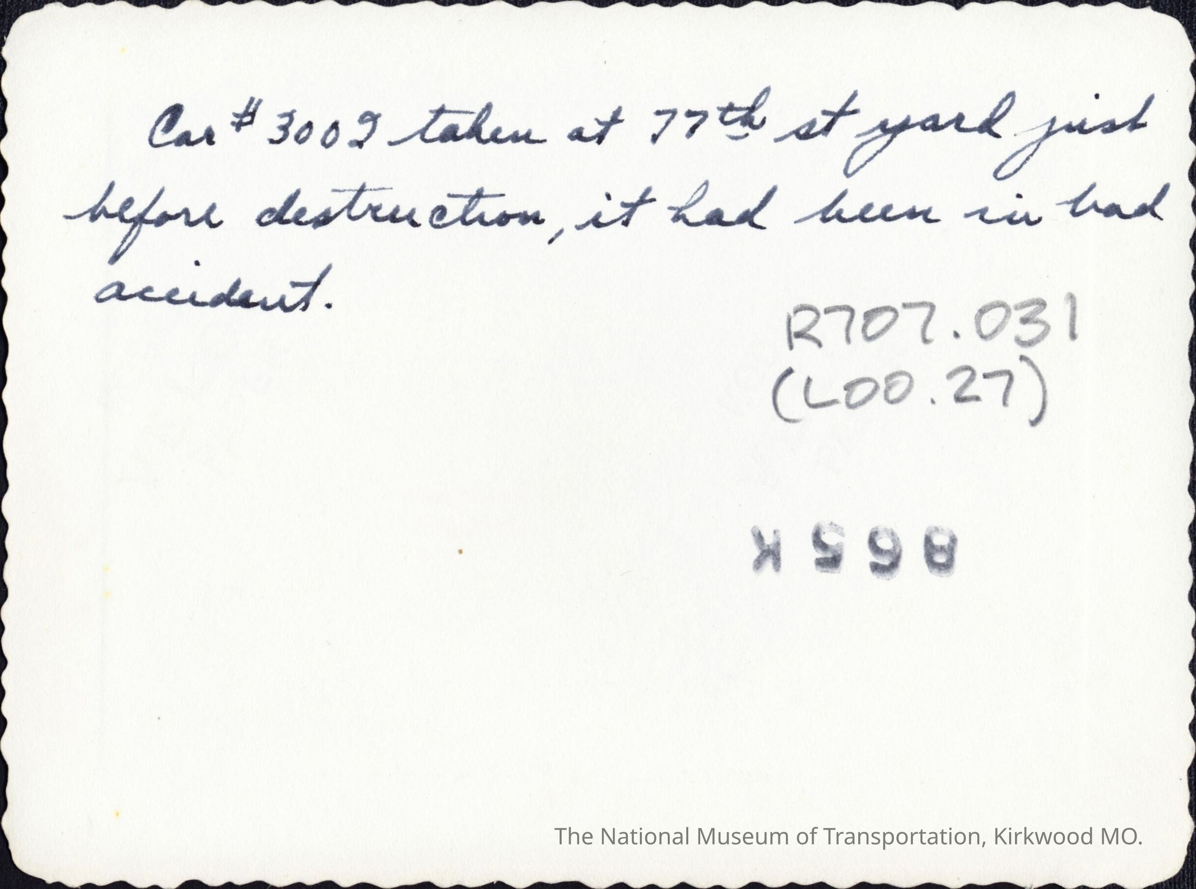 Car #3002 taken at 77th street yard just before destruction, it had been in bad accident.Language
