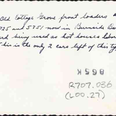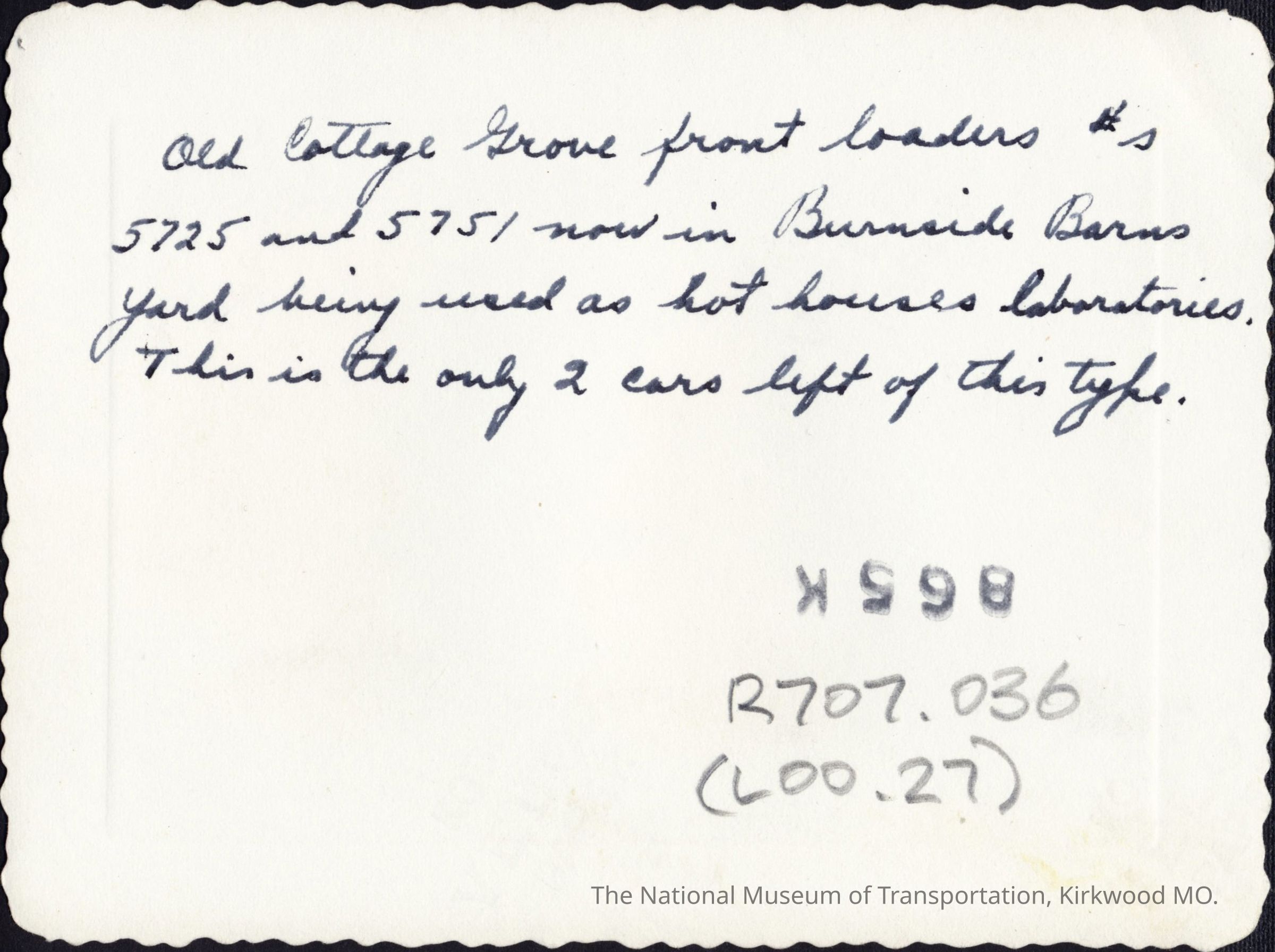Old Cottage Grove front loaders #s 5725 and 5751 now in Burnside Barns Yard being used as hot houses laboratories. This is the only 2 cars left of this type.Language