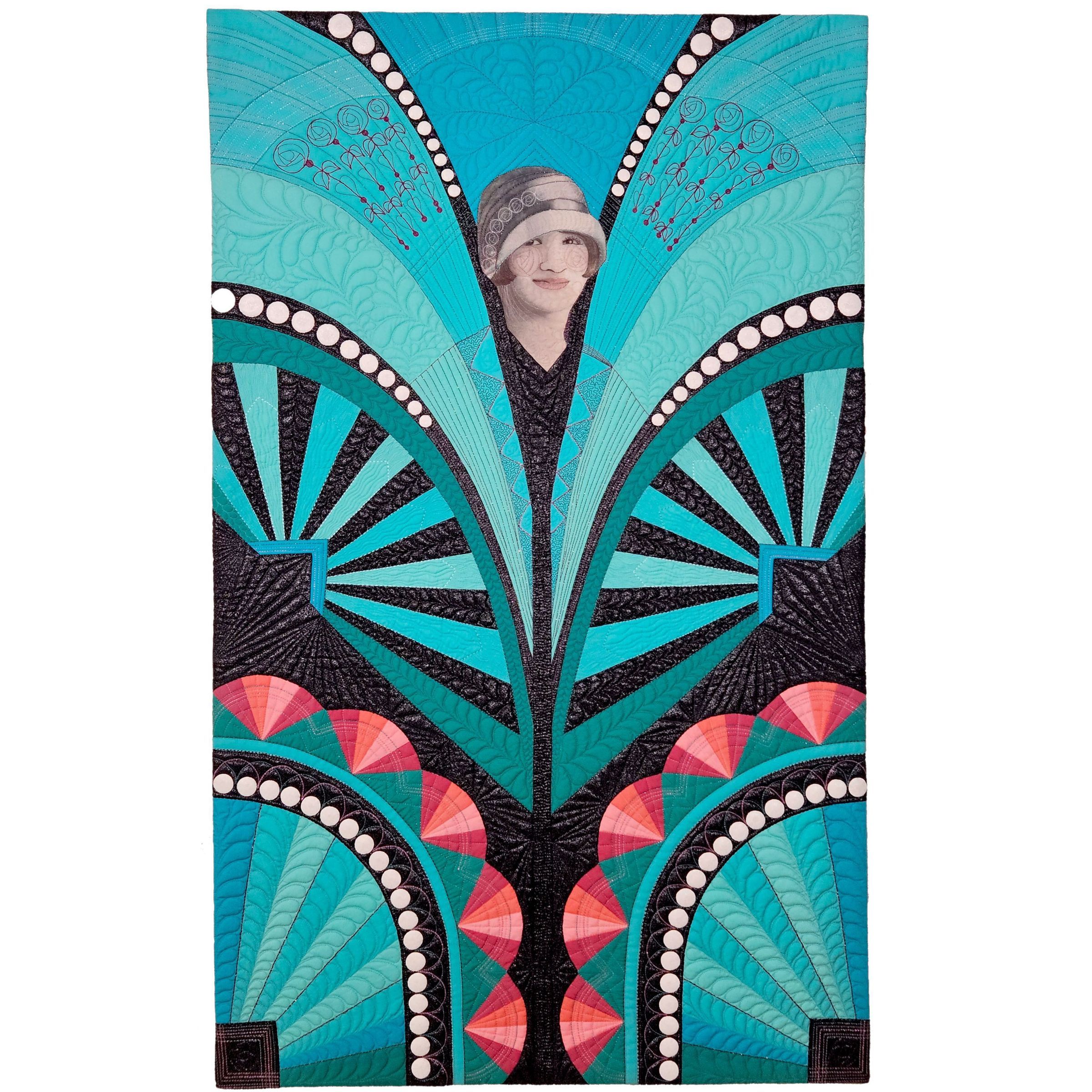 The traditional block “Grandmother’s Fan” was chosen to honor my grandmother Rose. “Rose’s Roaring Fans” celebrates the Art Deco style and Rose’s life growing up in the 1920s. Her flare for fashion with cloche hats, bobbed haircuts and drop-waisted dresses made her stand out in every photograph. The addition of hand appliquéd circles is a tribute to my mother Pearl who lovingly taught me how to sew.