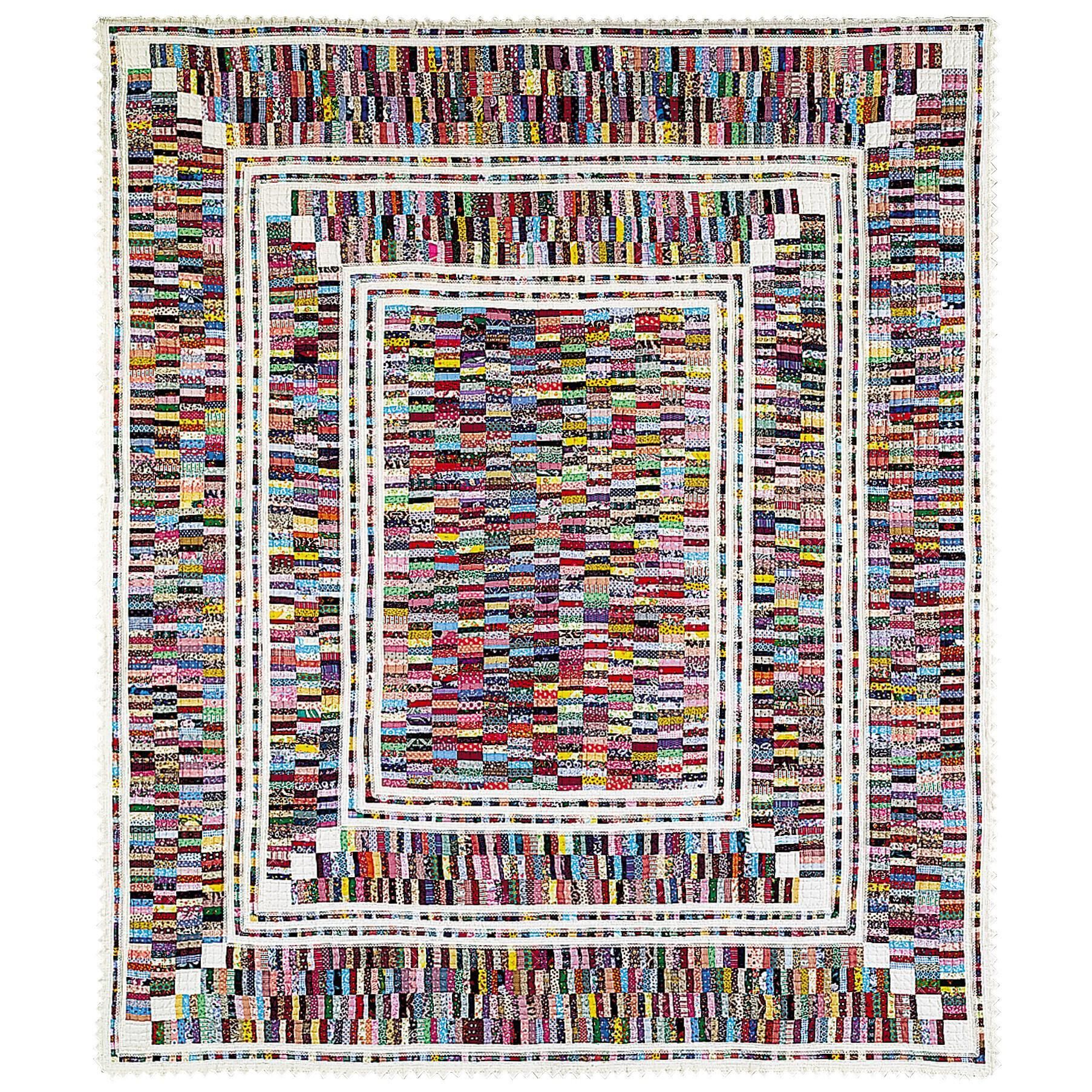 "Each year I attended a three-day seminar with approximately 50 women. A large sack labeled 'Louise's Scrap Collection' is conveniently placed for all to toss in their small clippings from projects they are working on--hence the rainbow of colors in this quilt. This quilt has 5,976 print pieces of 1 1/2" and 2 1/2" strips of various widths in many bright colors. One inch muslin strips edged with 1/4" lace create the rectangles. I have two large flat suit boxes under the bed and I will add more small pieces, sorted by colors, until I have 7,000 to make another quilt."Label