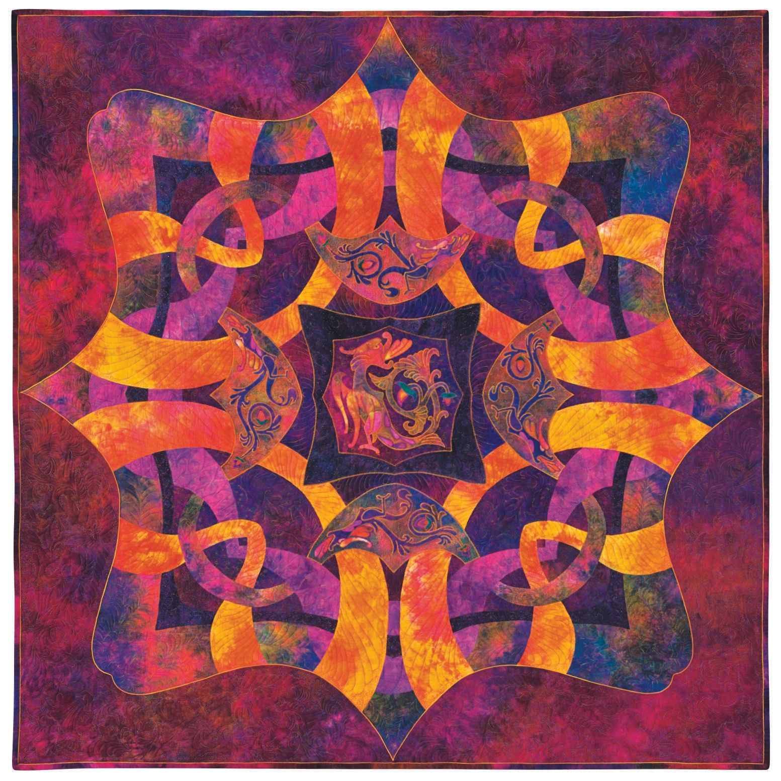 Ricky often works in a style he calls "Rhapsody quilts," where he divides the basic outline of the quilt into four quadrants, reversing and mirror-imaging the design. In this piece four more dragons were outline-appliquéd in a semicircle around the center dragon. Ricky's signature curves and points flowed from there. “I like to make easy quilts that look difficult,” he says modestly.