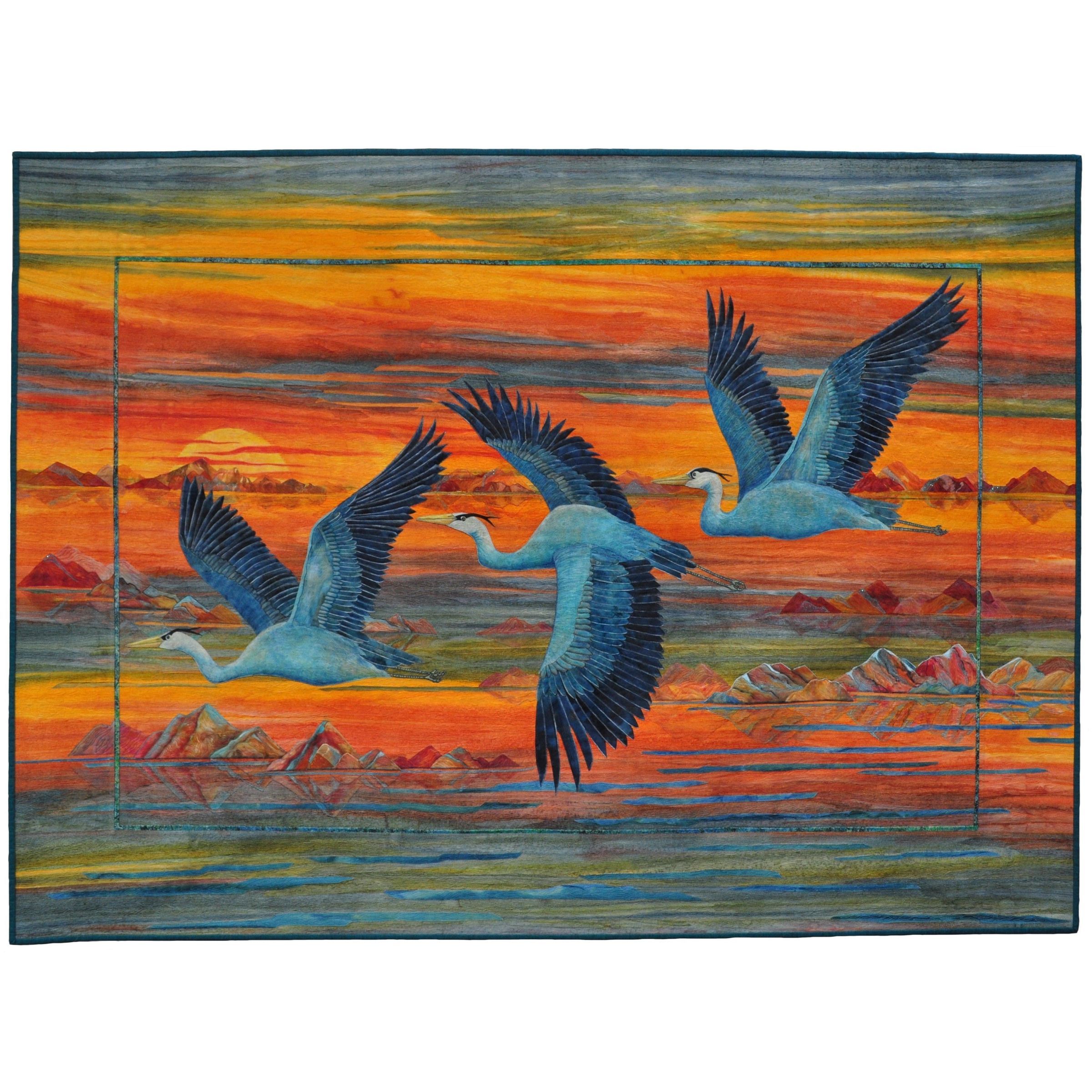"Majestic Flight" is Joanne’s interpretation of three large Great Blue Herons in flight. The birds were constructed separately. The bodies were thread painted and each feather was cut out, highlighted with inks, and fused one at a time. The background started with bright colors that were cut into strips and pieces and then fused together to resemble a sunrise. It soon took on a life of its own.