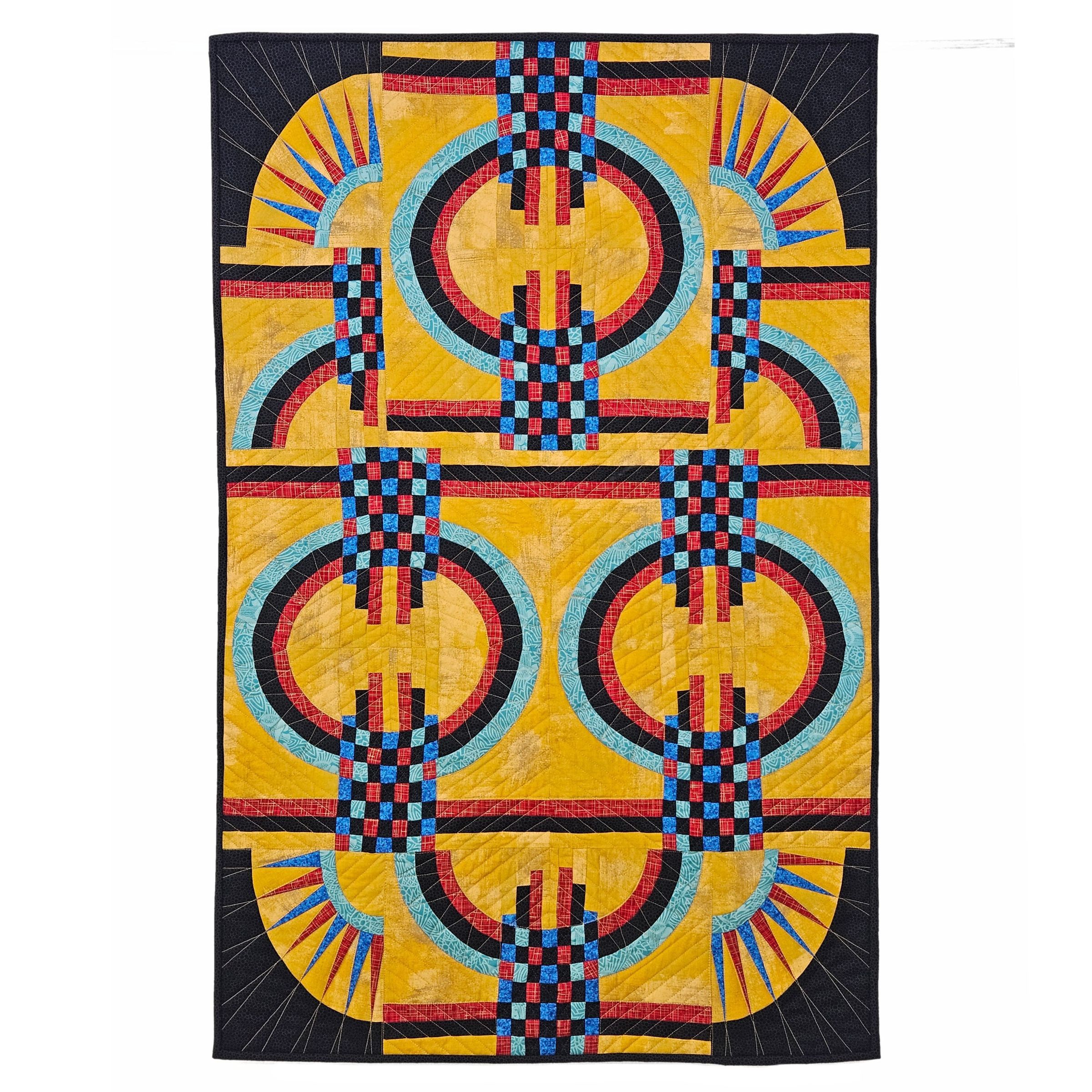 For my quilt I wanted to highlight the Art Deco design of the 20’s, which is considered symmetrical, geometric, and sleek, while also referencing “Tutmania”. The gold background fabric is a nod to his spectacular gold sarcophagus. The shape of the rings represent the amazing Egyptian collars made from lapis lazuli, carnelian, obsidian, and malachite. The overall design itself is created in the oval shape of a Pharoah’s cartouche. The New York Beauty blocks represent the papyrus flower native to the marshy edges of the Nile River.