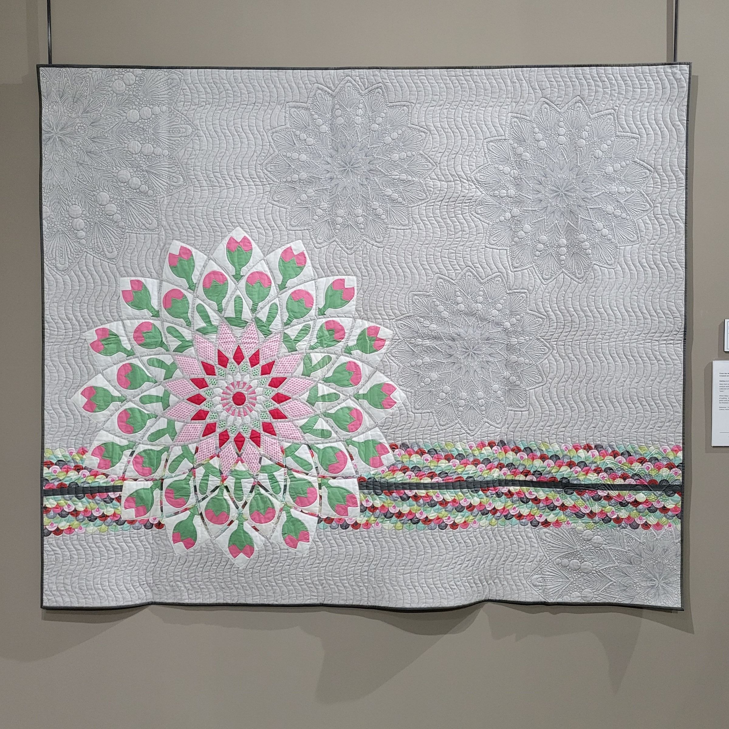 "When we received our quilt top, we were very excited to find we could take it apart into 14 appliqué blocks. Kim envisioned a new block from the old ones using our appliqué technique. Because of the size of the appliqué buds, she decided that she needed to do something big. After trying several options she decided on a Dahlia. And keeping with the modern theme, Kim designed some very modern quilting motifs. Once the decisions were made, the patterns were drawn and sent to JoAnn.