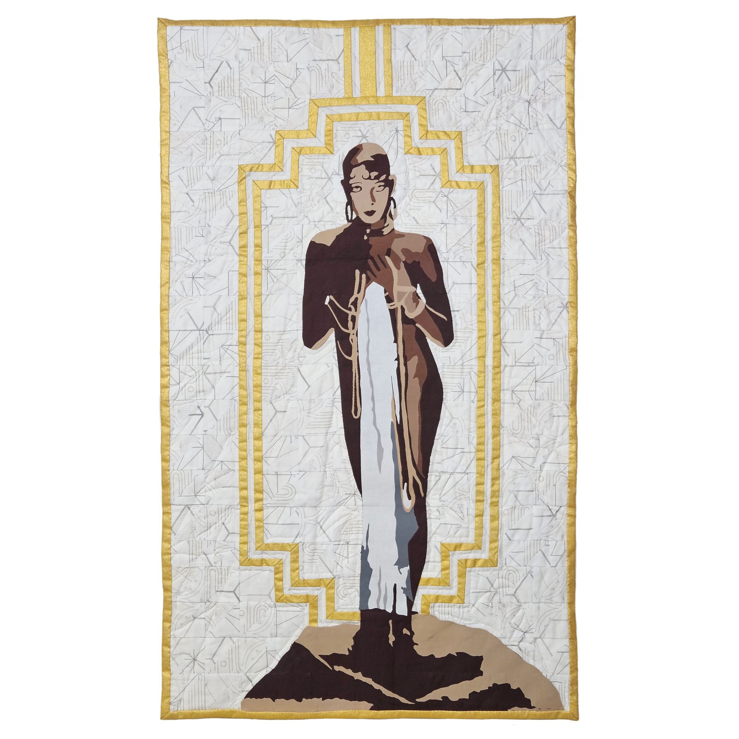 As I was searching through the music and dance of the Twenties, I learned of Josephine Baker. I found the portrait taken of her by George Hoyningen-Huene and found it to be the best representation of the sexual freedom many women found and the boldness that defined the time. The quilted halo and rays are nods to her later life as a WWII spy, her adoption of her Rainbow Tribe, her work in the Civil Rights Movement, and her conversion to Catholism.