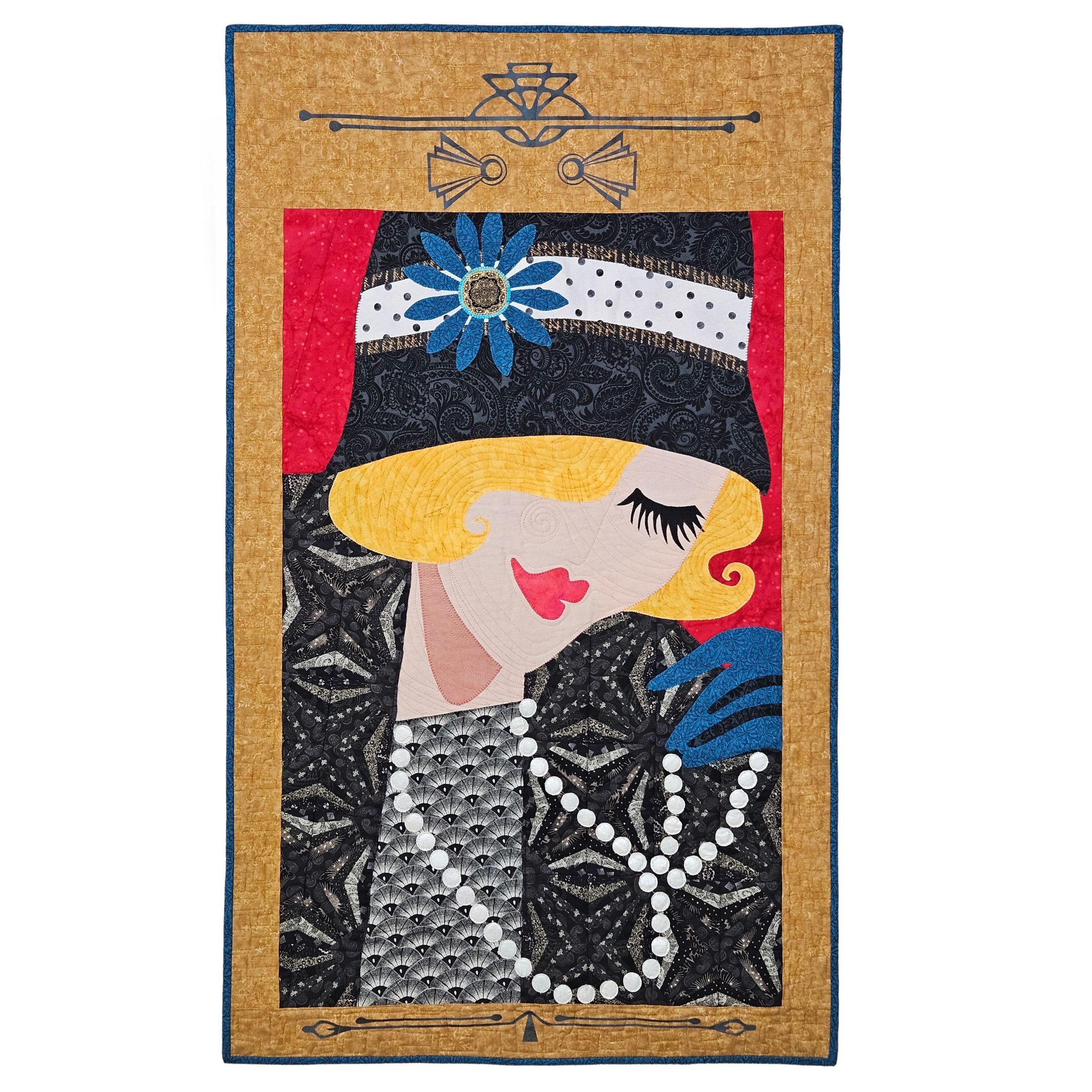 Paper-piecing, raw-edged applique, cutting machine for Art Deco designs used in the top and bottom of the “picture frame.” Free-motion machine quilting.Note Type