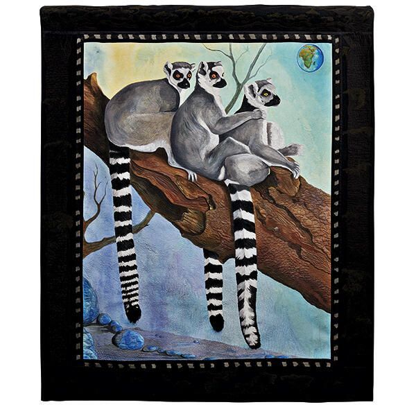"I am very proud of this quilt, not only because these lemurs are stunning, but because it was the hardest quilt I had to make. This quilt took me two plus years to complete, through some very difficult times. I lost my mother to Alzheimer's disease and also lost some other special people in my life. But it inspired me to keep going. To me this quilt represents not only the endangered species of this beautiful planet, but also how we all endanger our relationships with each other, this earth and our creator. Beauty results when we work through life's challenges and don't give up on it.