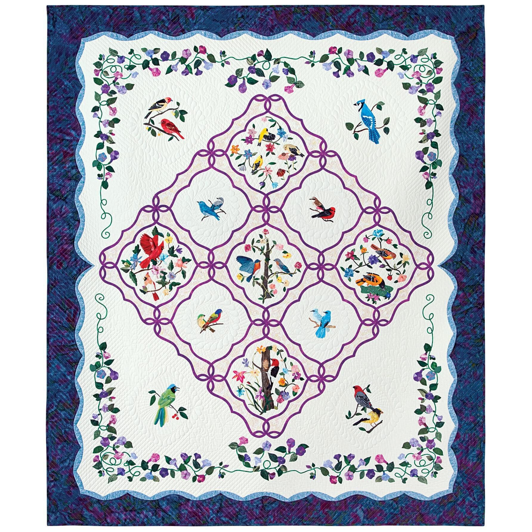 "Feathered Beauties is an original design inspired by my love of nature and my fascination with the variety of birds that visit my home in Larkspur, Colorado. Many of the birds shown in the quilt don’t actually visit my area, so I had to rely on field guides, photographs, and lots of birding books to draft the patterns.