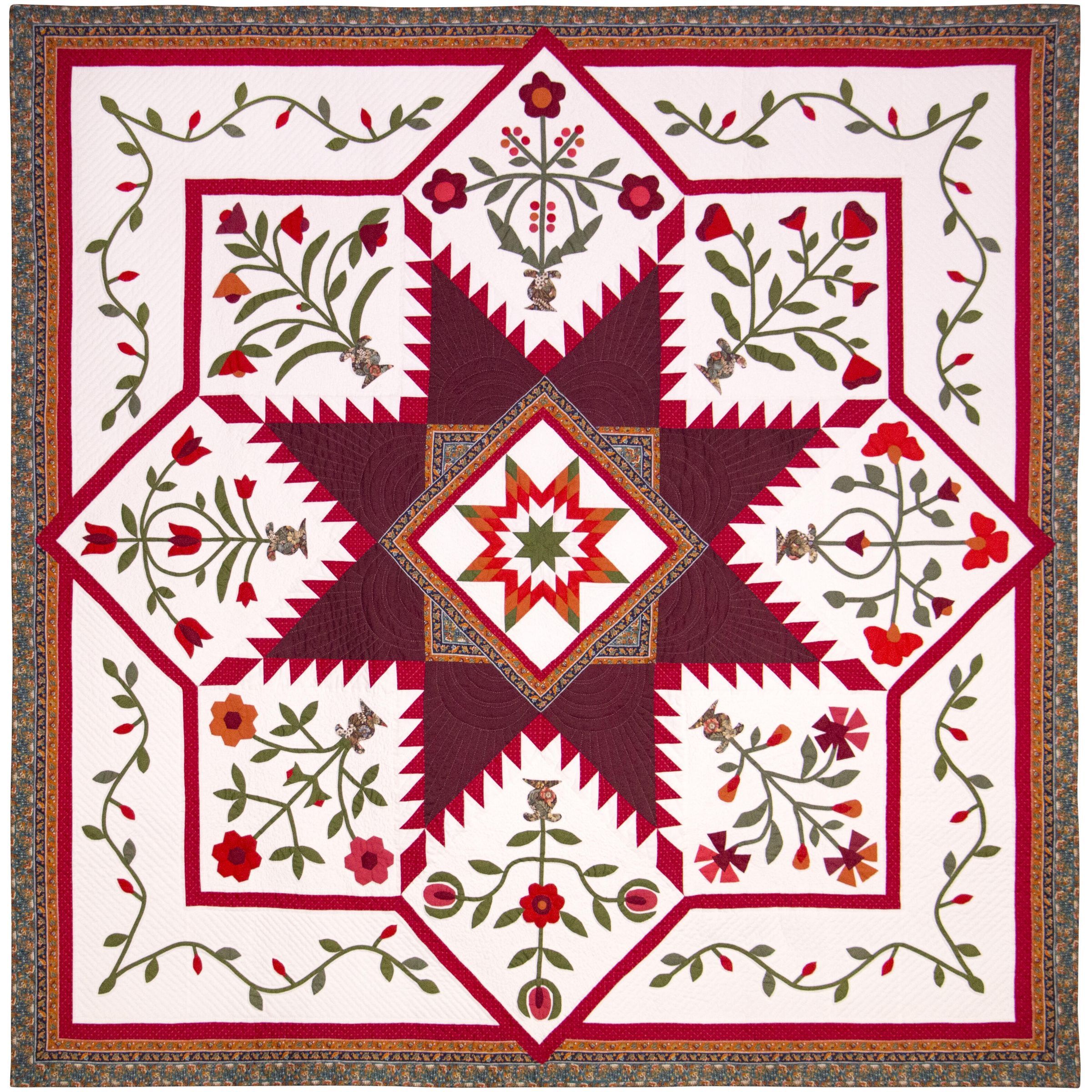 "In creating this quilt, I started to make a flower applique quilt and as often happens to me, I was not satisfied with the layout and decided to change my whole concept. I made a large feathered star center and placed various flower blocks around it. I added multiple borders and heavily hand quilted it. After various setbacks, changes, and running out of one fabric, this quilt was completed in a little over a year. Each quilt or wallhanging or challenge block I make, I find a new technique to try. This is what keeps quilting so interesting, satisfying and fulfilling. I only wish that I had started quilting earlier in my life."