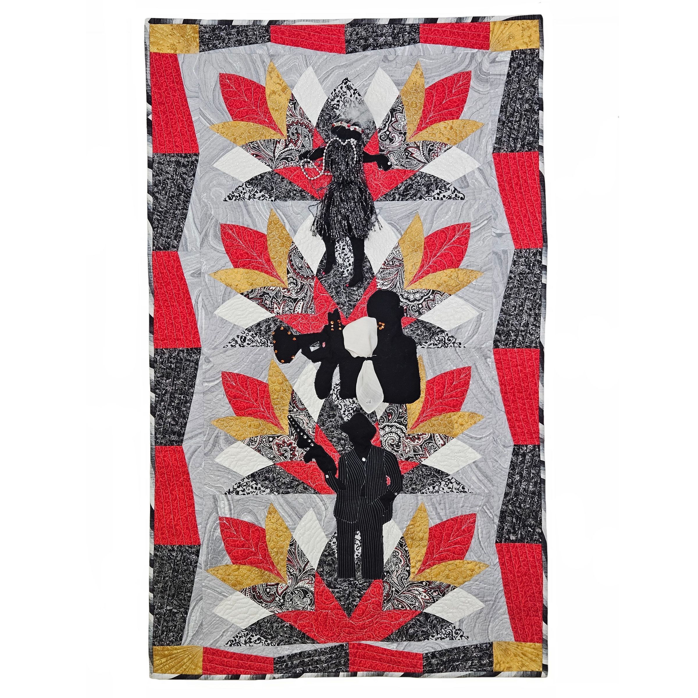 Quilting cotton, hot-fix crystals, handkerchief, pearl string, fringe, sequins, feather, chiffon, cotton batting.