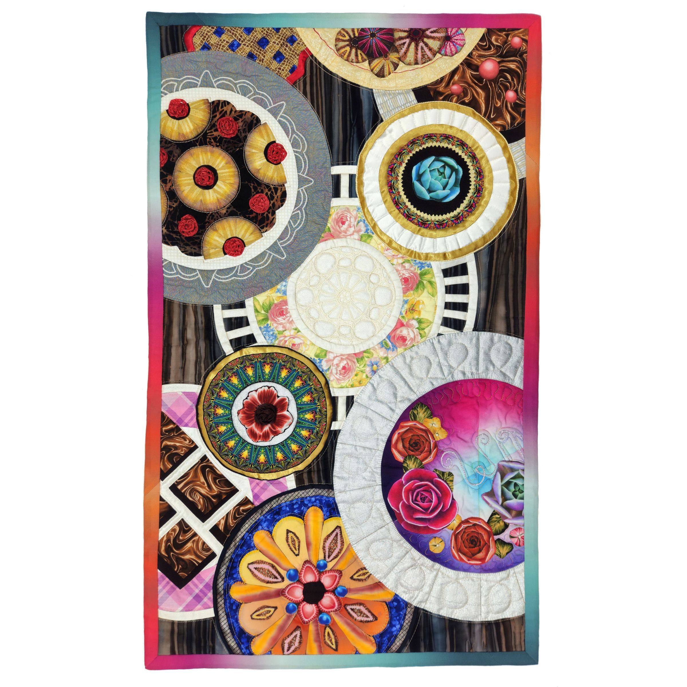 Quilters cotton, batik, repurposed bed sheet, and vintage doily. Satin and metallic fabric accents. Cotton batting.