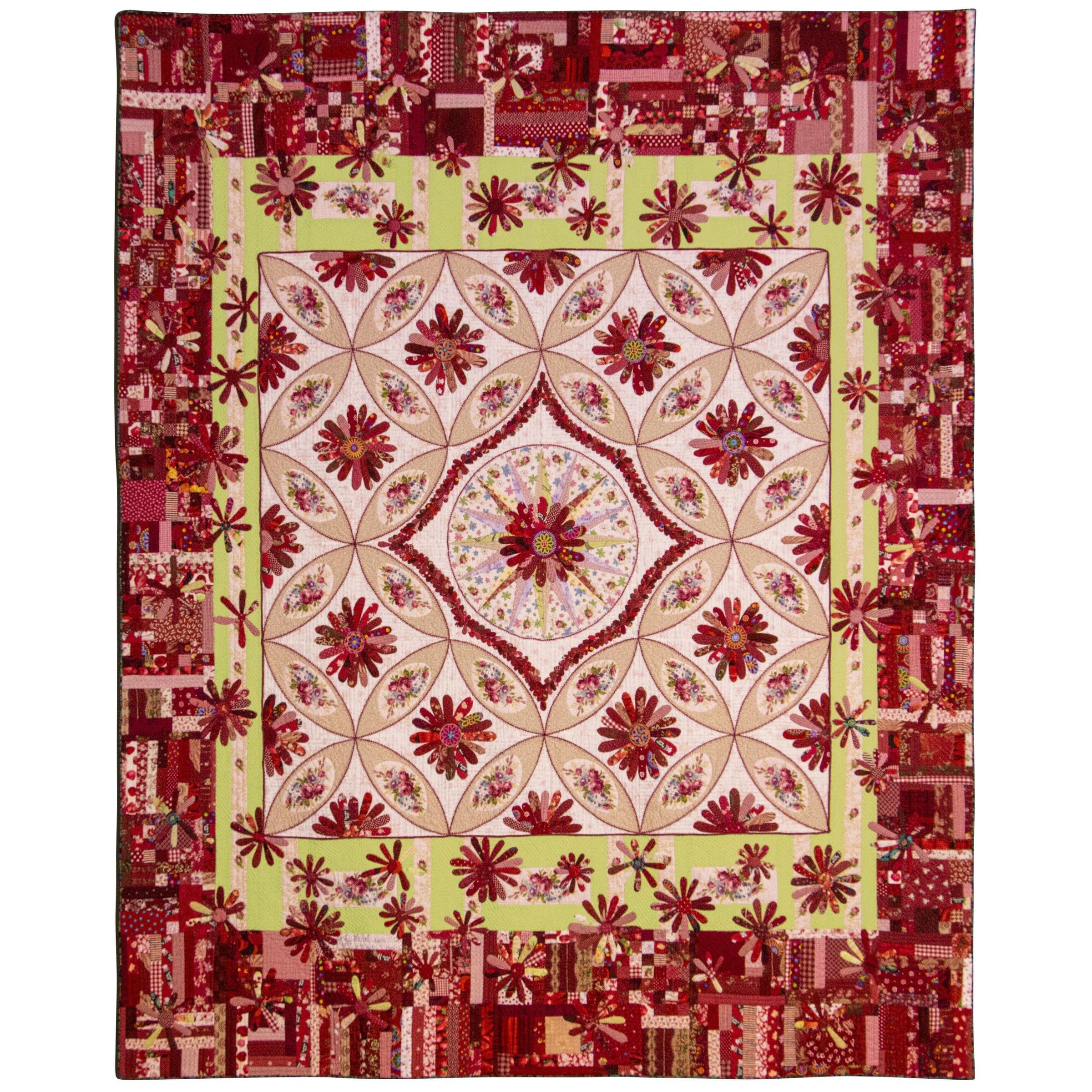"This is schemed based on red in order to cheer us up. I really enjoyed quilting with memorial fabrics. This also celebrates our golden wedding."