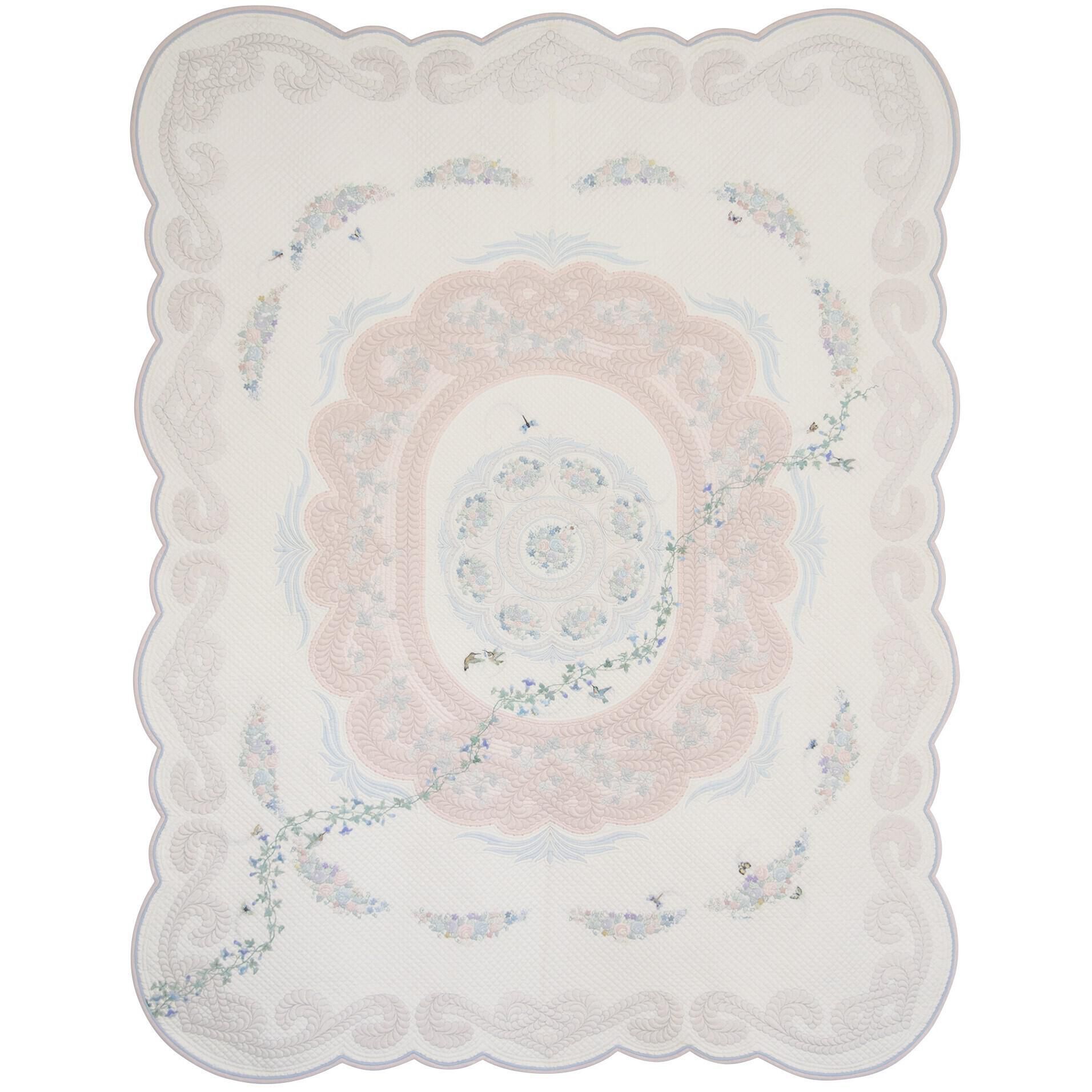 Vintage molded ceiling designs were the inspiration for the trapunto (stuffed work) in this quilt. Hand embroidered details include butterflies and other creatures, with “fairy dust” to emphasize their energy. The trapunto areas were “stab stitch” quilted with colored thread, through the quilt top and a second layer of muslin. These areas were then stuffed with colored yarns to add subtle shading. Batting and backing were added and the final “stab stitch” quilting was done through all layers.