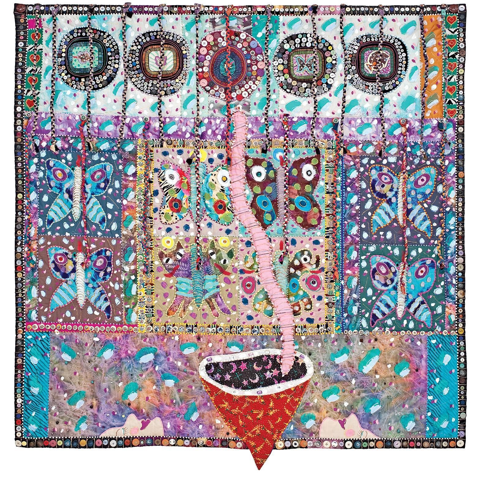 On the top section of Life on Three Levels, Therese has placed her “Flying Saucers” to represent the Universal level of life. “The middle level is the physical, suggesting the transformational nature of our life on the planet. The two profiles on the bottom of the quilt represent the dreamers. In the center is a cone-shaped container with a pink streamer which carries the dreams and ideas back to the top, giving us a continuation of the creative process.”