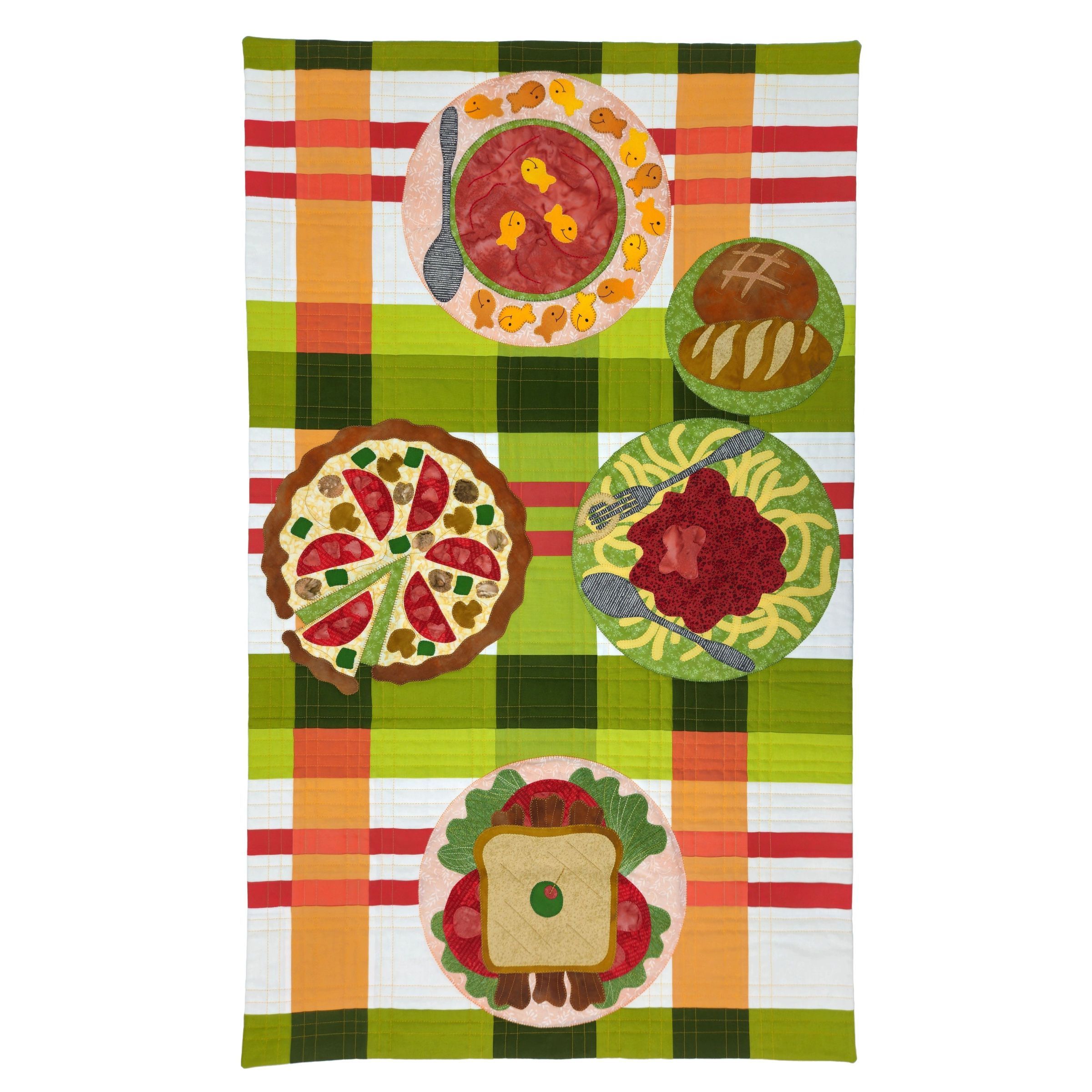 "Using a grid of nine patch blocks I colored lines to draw a plaid design which I pieced to create a tablecloth. Four plates of food with a common theme of four ways to enjoy the tomato. I used an artist binding (facing) instead of a binding to not break the illusion of the tablecloth."