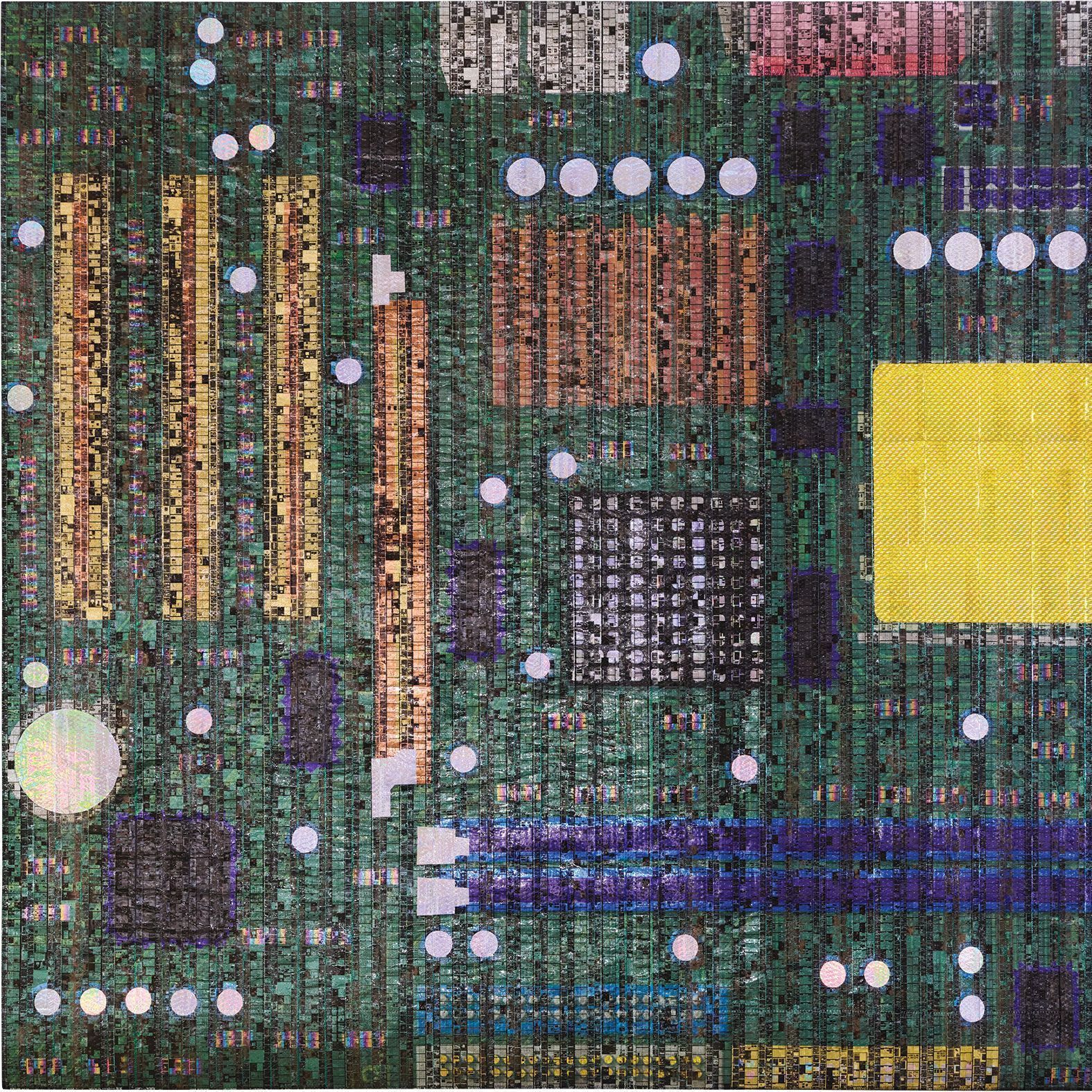Digital specialty perforation tape, recycled auto industry Mylar, recycled library 35 mm microfilm, monofilament and cotton threads, Holographic tape, Pellon, polymer medium, cotton fabricNote Type