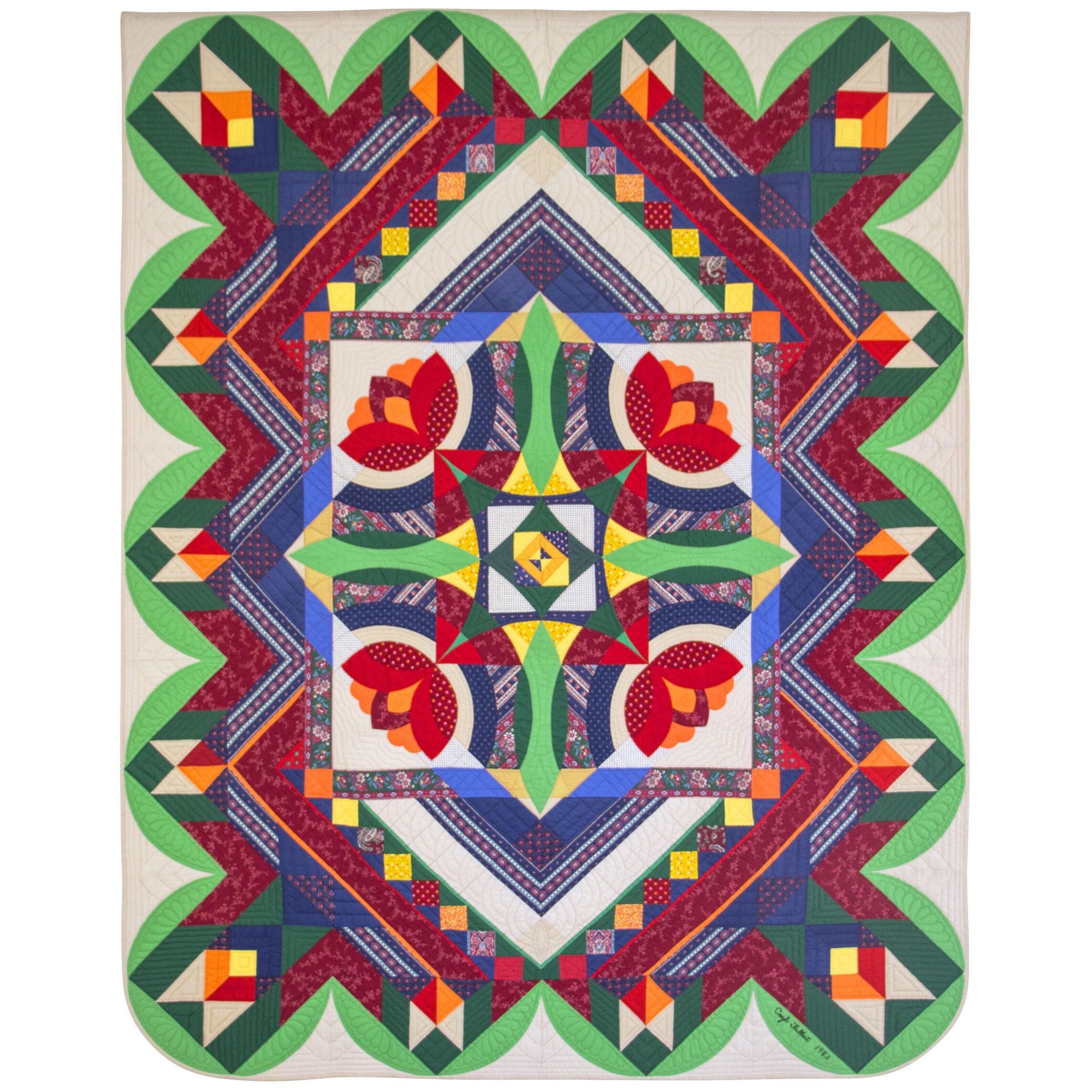 "The design for the center of this quilt was inspired by looking through a kaleidoscope. I wanted it to be somewhat floral, so I designed abstract poppies for each corner of the central panel."