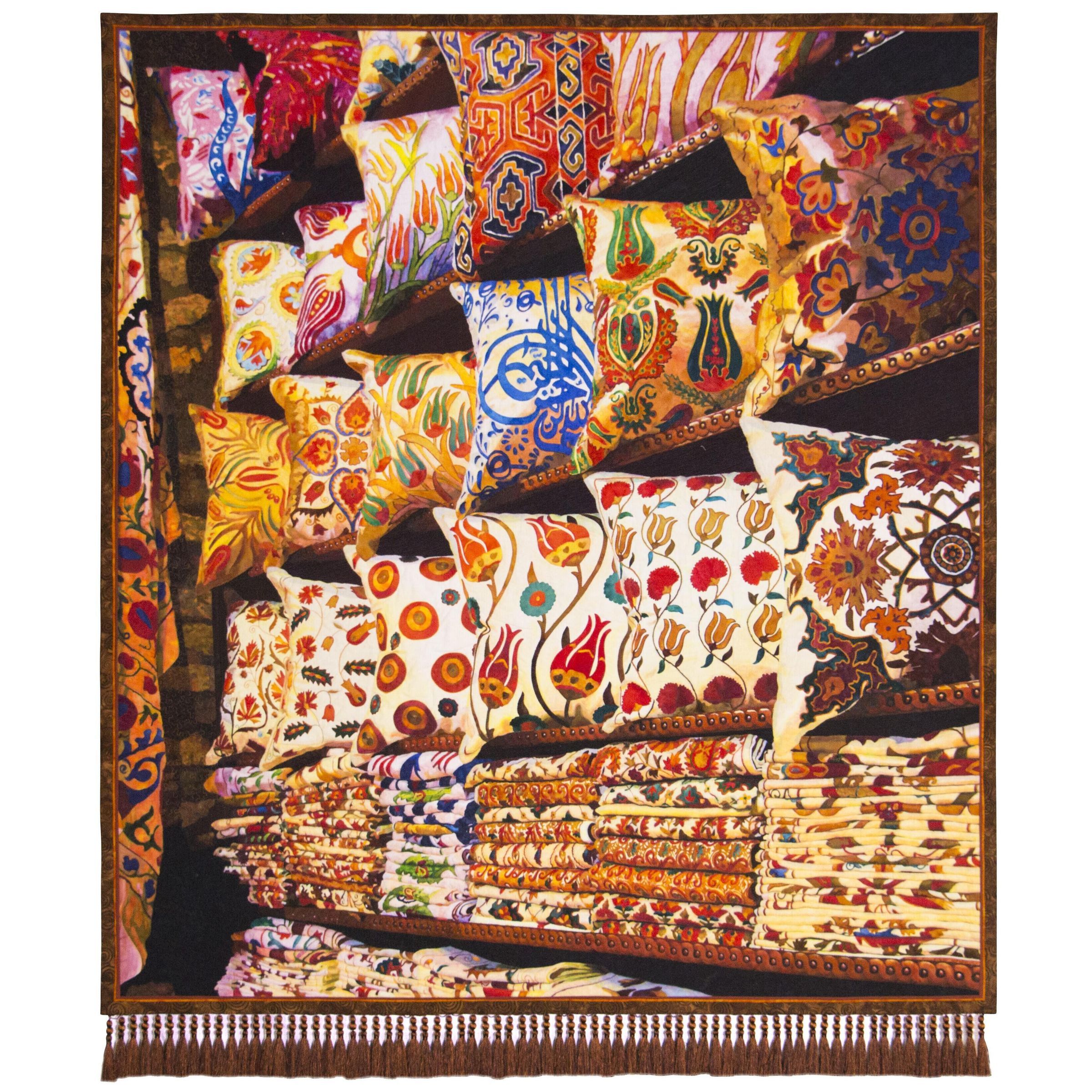 “Where east meets west in Istanbul, there is a Spice Bazaar that has been there since 1597. There, surrounded by exotic smells and tastes, the vibrant colors of the silk road come alive. One vendor had so many ornate pillows of various colors and designs, it was like viewing an appliqué sampler. The quilt took five months to make. It is created with layers of fused raw-edge batiks. I thought the designs on the pillows were something that many appliquérs would appreciate and that it would be a busy enough design for me to enjoy working on for many months. After about 4 months into the project, I wondered, “What have I got myself into?” The detail on the bottom section nearly put me into a straight jacket. But as with all my quilts, I just faced the challenges head on, a little more each day, until it was finally completed.”