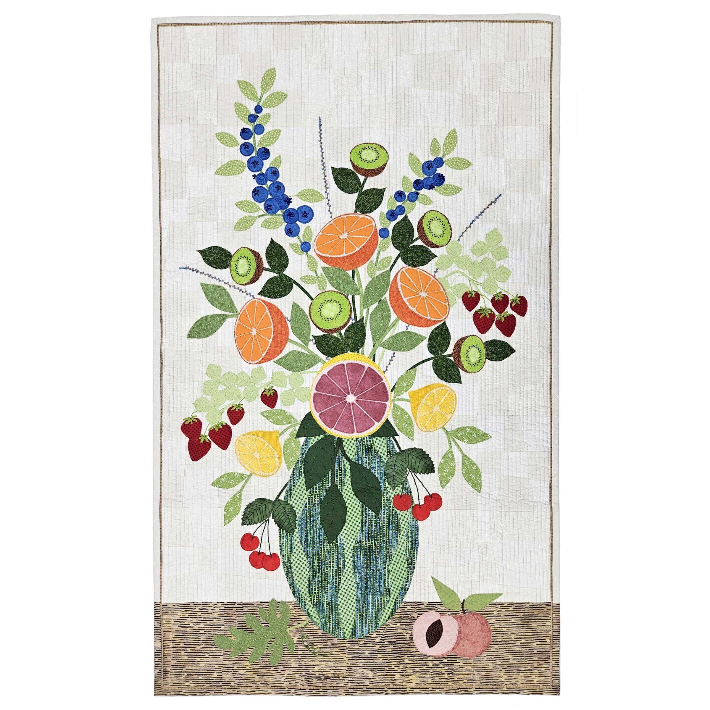 "I have designed both ”donut” and “button” bouquets. So I thought, why not a bouquet of nine summer fruits, highlighting their outer beauty and or “cut” design, vibrant colors, textures, and the variety of different leaves associated with each. This design allowed me to use free motion quilting, raw edge appliqué, and hand embroidery; three of my favorite techniques."