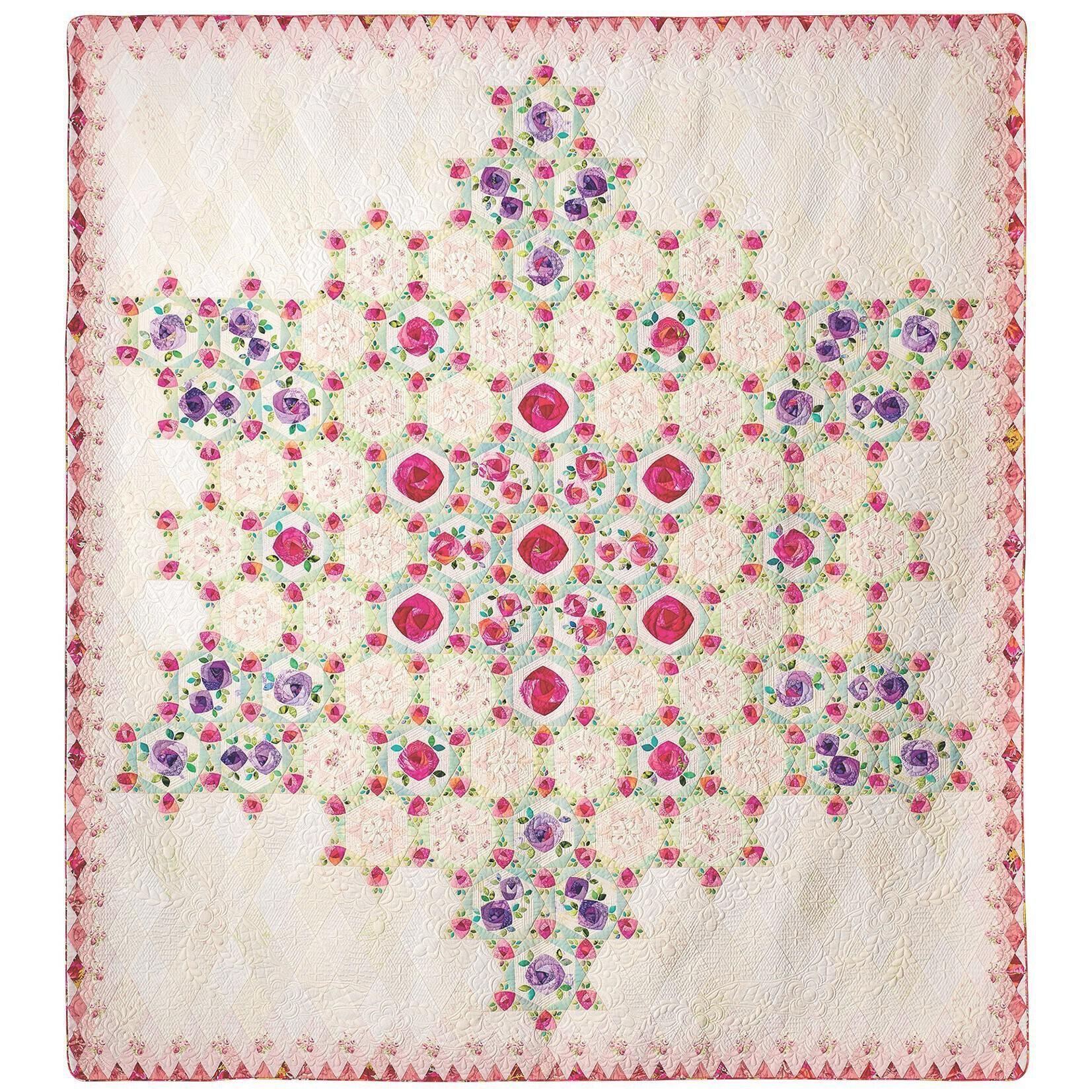 Using her graphic design background, Keiko took more than two years to create this stunning handpieced-and-quilted entry with a combination of diamond and hexagon shapes. Multiple fabrics of varying values of pinks and lavenders create the lush rose blossoms and buds, with extensive use of shadow trapunto in the alternating blocks. The combination of several shades of off-white adds subtle complexity to the background. Although the hexagons appear more prominent, Keiko hopes viewers note the diamonds as well, seeing as this quilt began with a little diamond and "just kept growing."