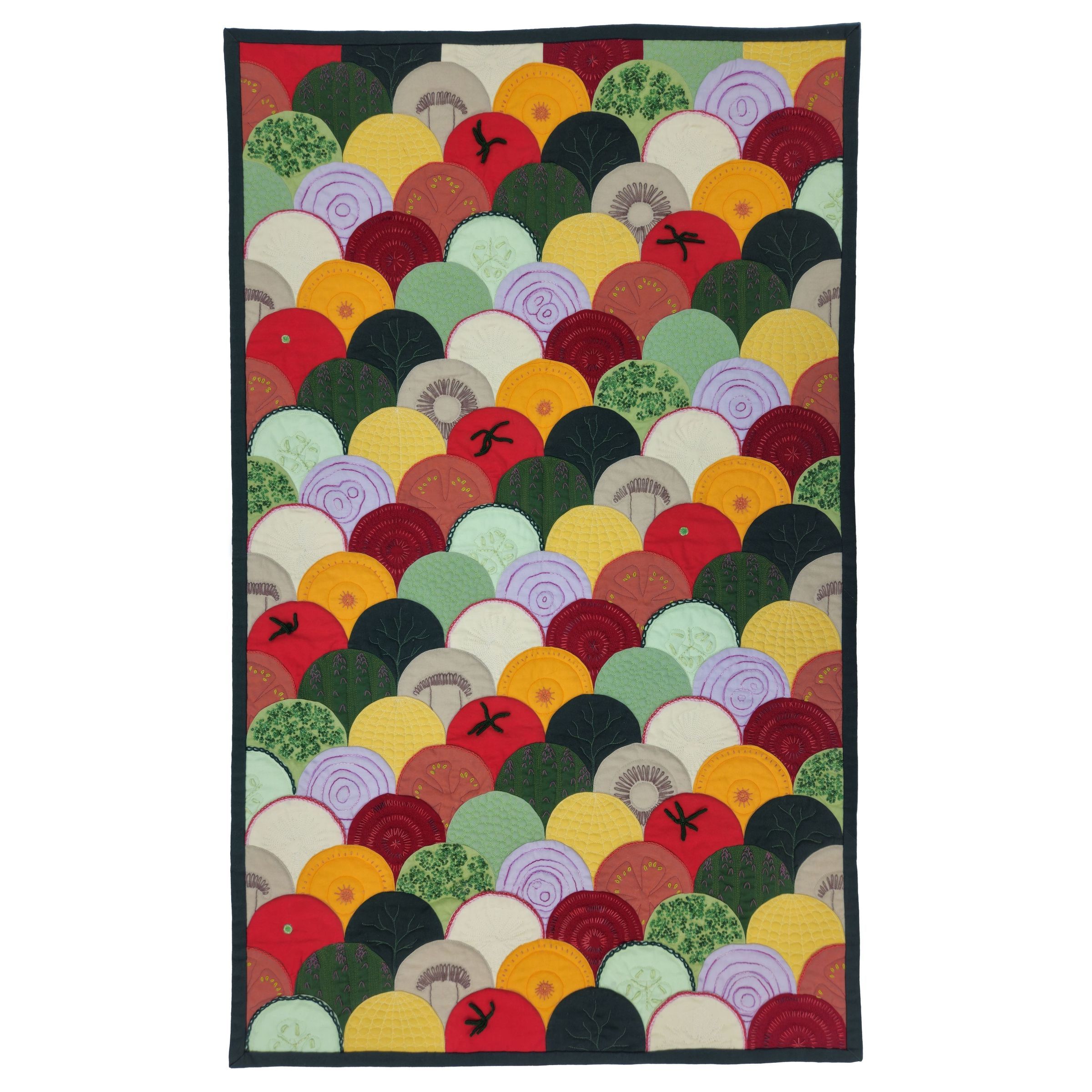 "The classic clamshell design is reimagined as a layered veggie platter. The pieces were carefully cut, machine pieced and then embellished with hand embroidery involving hundreds of tiny colonial knots (broccoli), feather, daisy & chain stitches, and needle-woven 3D tomato leaves. Machine quilting provides additional texture. As a cheeky nod to the theme, the quilt’s label is made to look like a salad dressing label. The curved piecing and handwork were incredibly labor intensive, so feast your eyes on the quilt!"