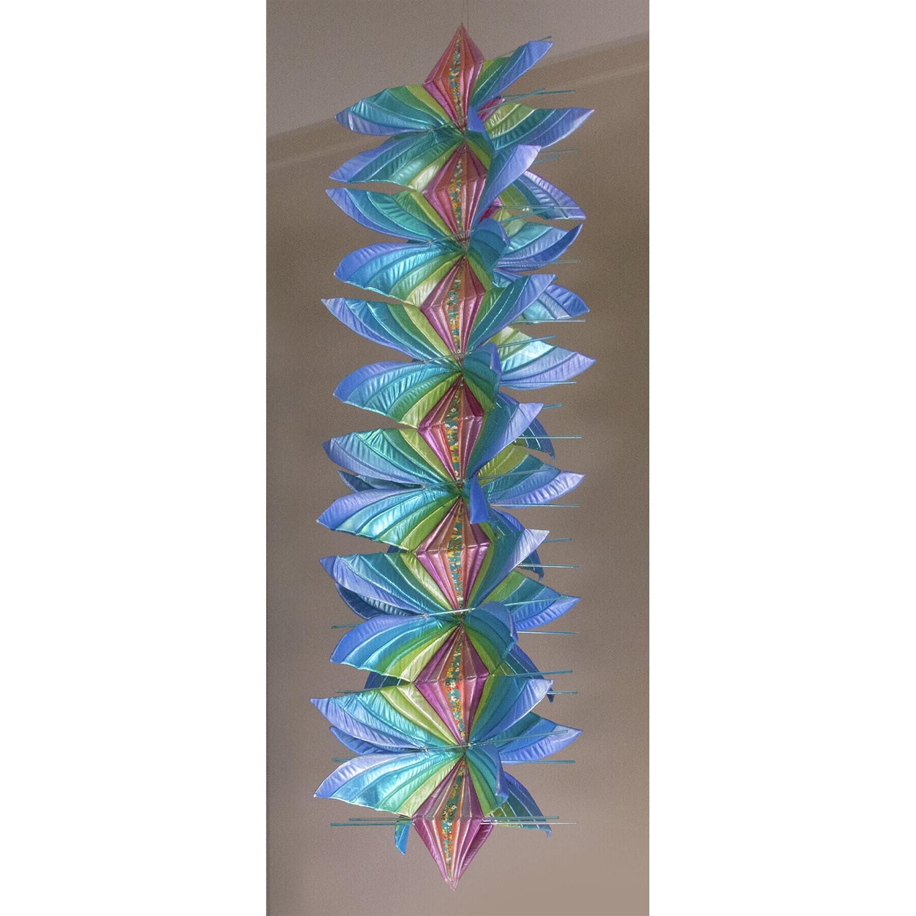 Silver Mylar polyester, acrylic paint, acrylic rods, Japanese paper, car headliner, beads
