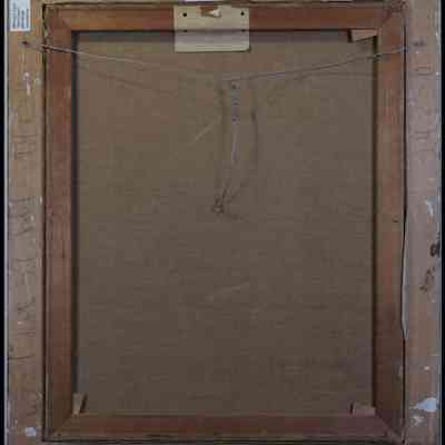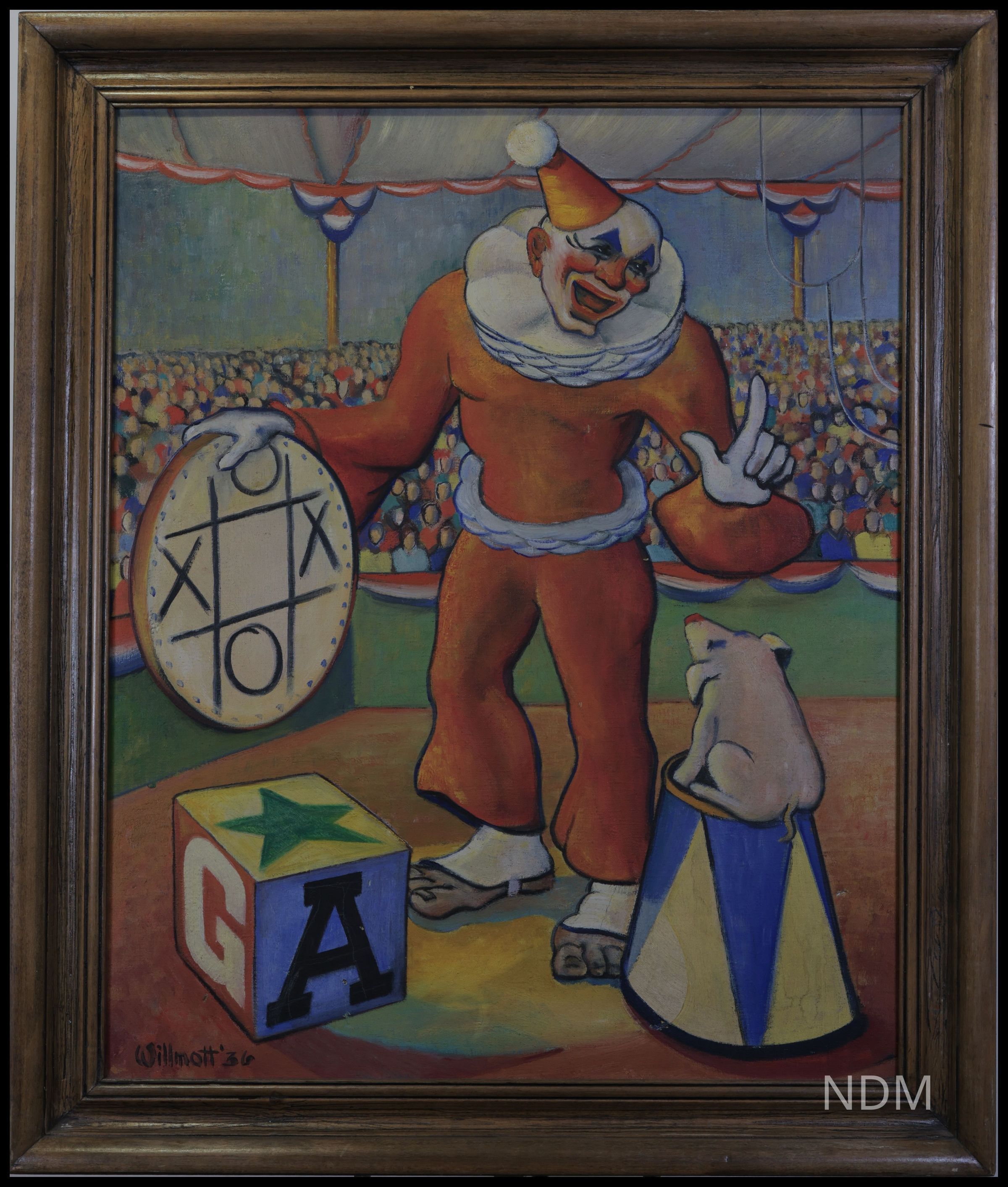 A clown dressed in a red costume and ruffled collar holds up a game of Tic-Tac-Toe to play with a dog—or is it a pig, given the body shape and curly tail? Behind them, a large crowd under a big-top tent watches the two perform. It’s not entirely clear what the clown’s gesture signifies, nor what the animal is supposed to do next. Willmott imparts colorful detail to the clown’s eyes, face and makeup, to the props of his trade. As with the work of fellow NDG artist Gerrit Hondius, there may be overtones of social criticism in circus paintings during the Great Depression.Collection