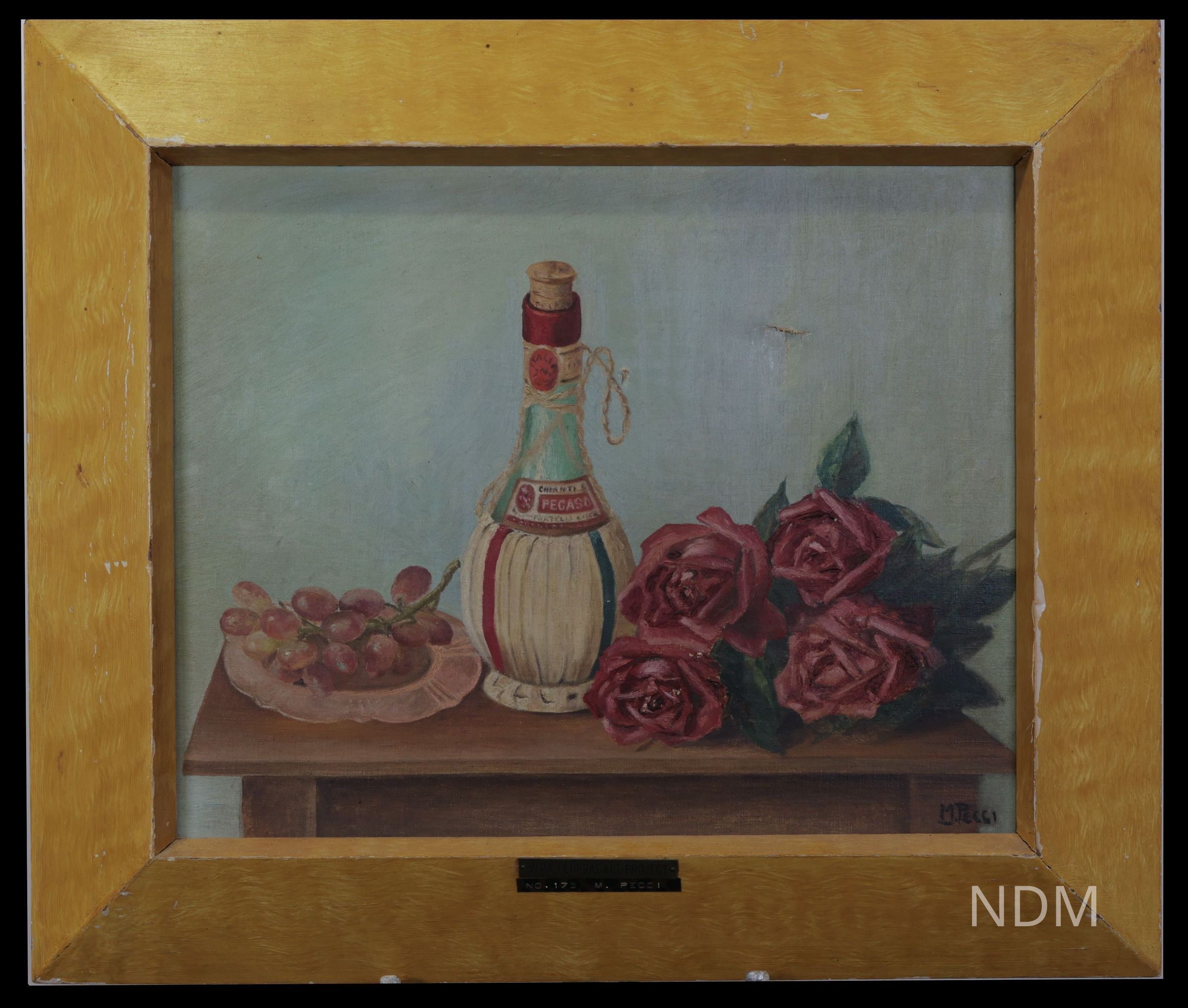 Upon a table we behold a composition in red: a bunch of grapes, a bouquet of red roses, and a bottle of Chianti its classic straw basket (called a fiasco). Once we factor in Pecci’s white wall and green leaves, it would seem that these colors of Italy aren’t accidental—the still life grows out of a powerful nostalgia for home.Collection