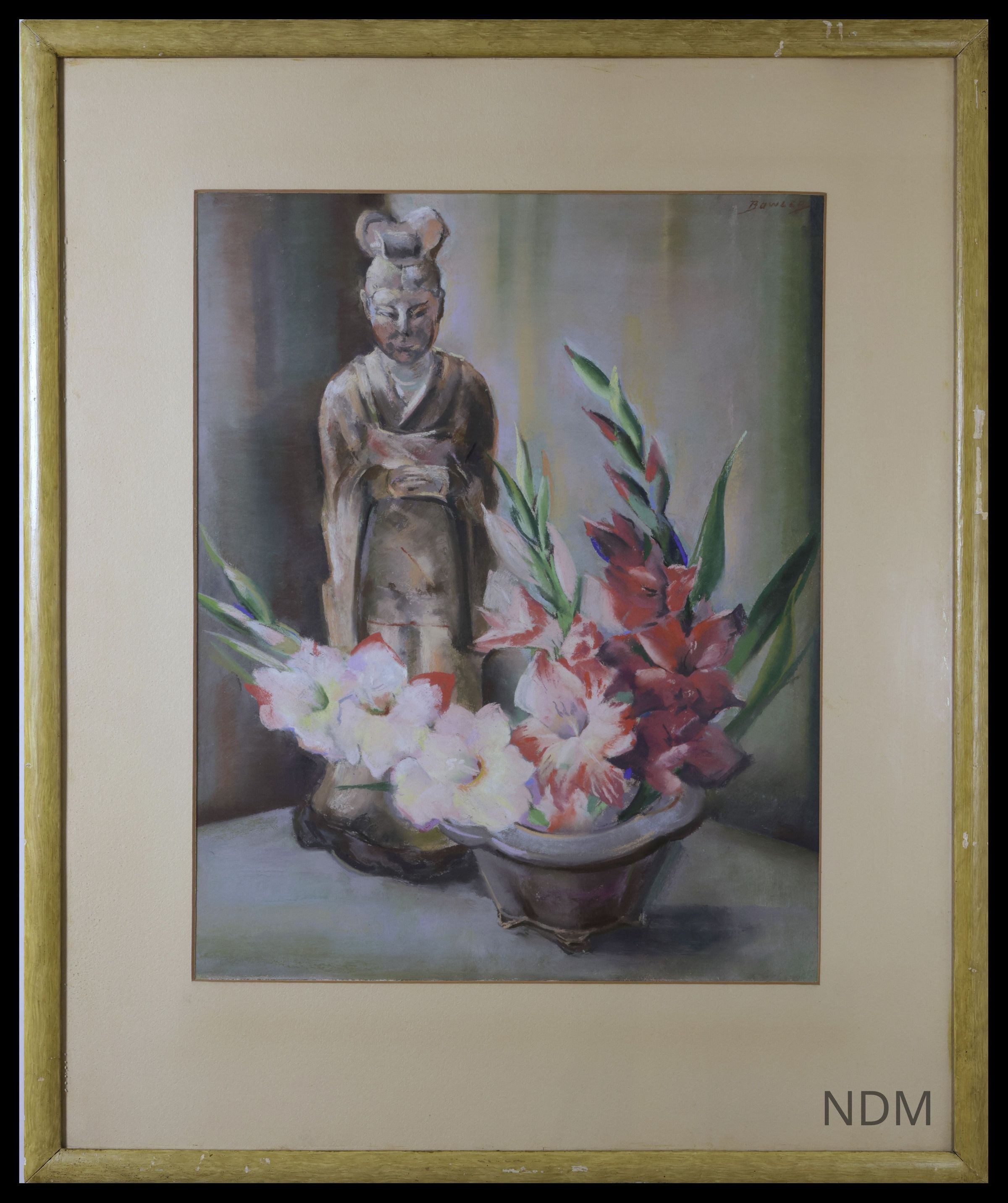 Light pastels of white, red, green, and silver create a delicate and private image of an East Asian figurine behind a short pot of flowers, possibly lilies. The background is very bare and gray-scale, emphasizing the bright colors of the flowers. The white-to-red color transition of the flowers from left to right implies a period of change, more specifically from purity to maturity.Collection