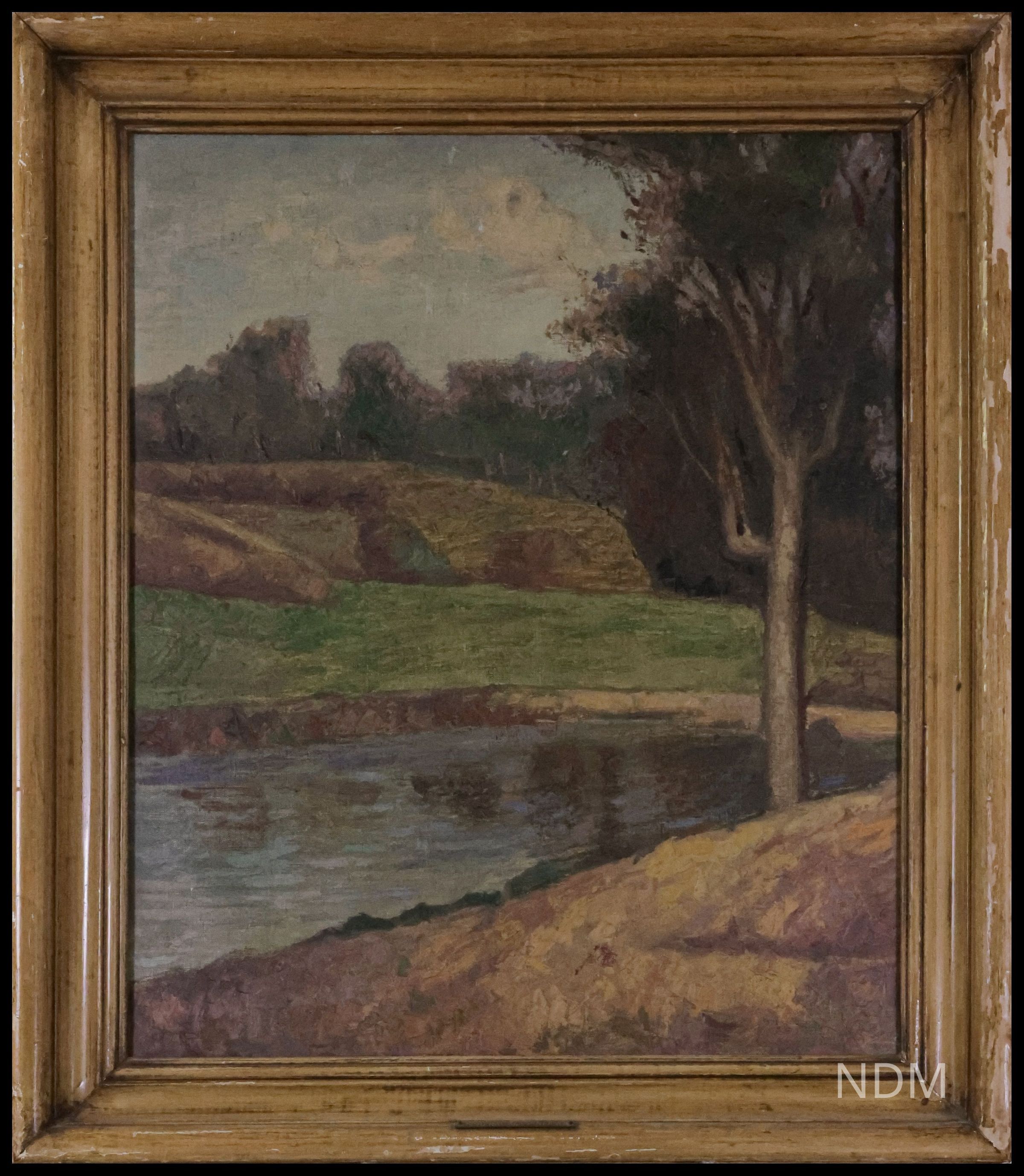 A mass of rocks at upper left is mirror by rising ground at lower right in this impressionist composition. Earth tones predominate, even in the water's surface, except for a delicately colored sky and treetops--at sunrise or sunset?Collection