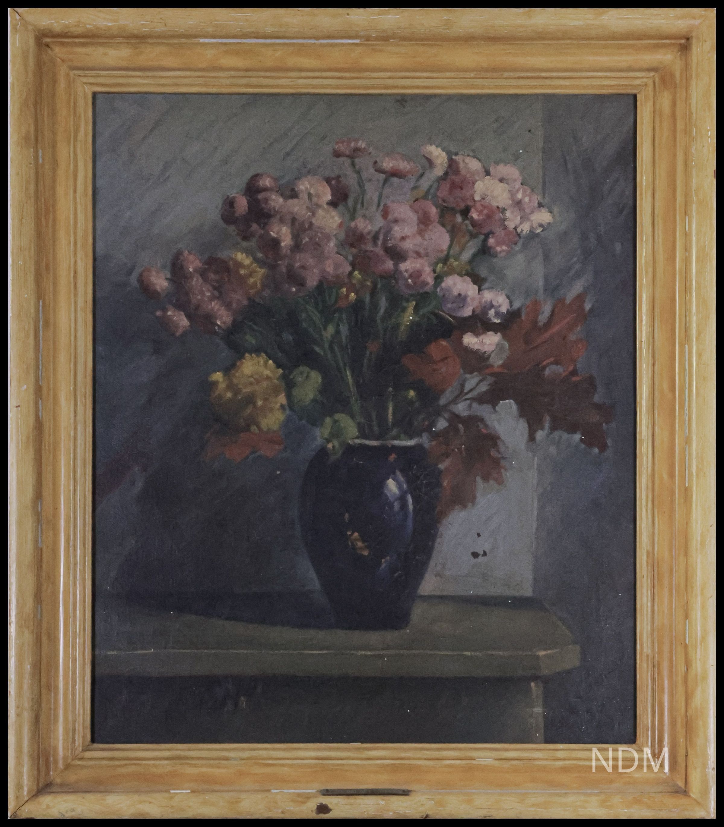 A side table, situated at the corner of two walls, displays a cobalt-blue vase filled with profuse blooms and fall foliage. Blue, cross-hatched walls and the table’s gray tone harmonize with the bouquet’s primarily pink and rose tones. The painting’s drama comes via light from upper right that is reflected upon the vase, sets apart its floral blooms from the background, and modulates the walls different tones. Compare the aesthetic here to his more experimental “Flower Study.”Collection