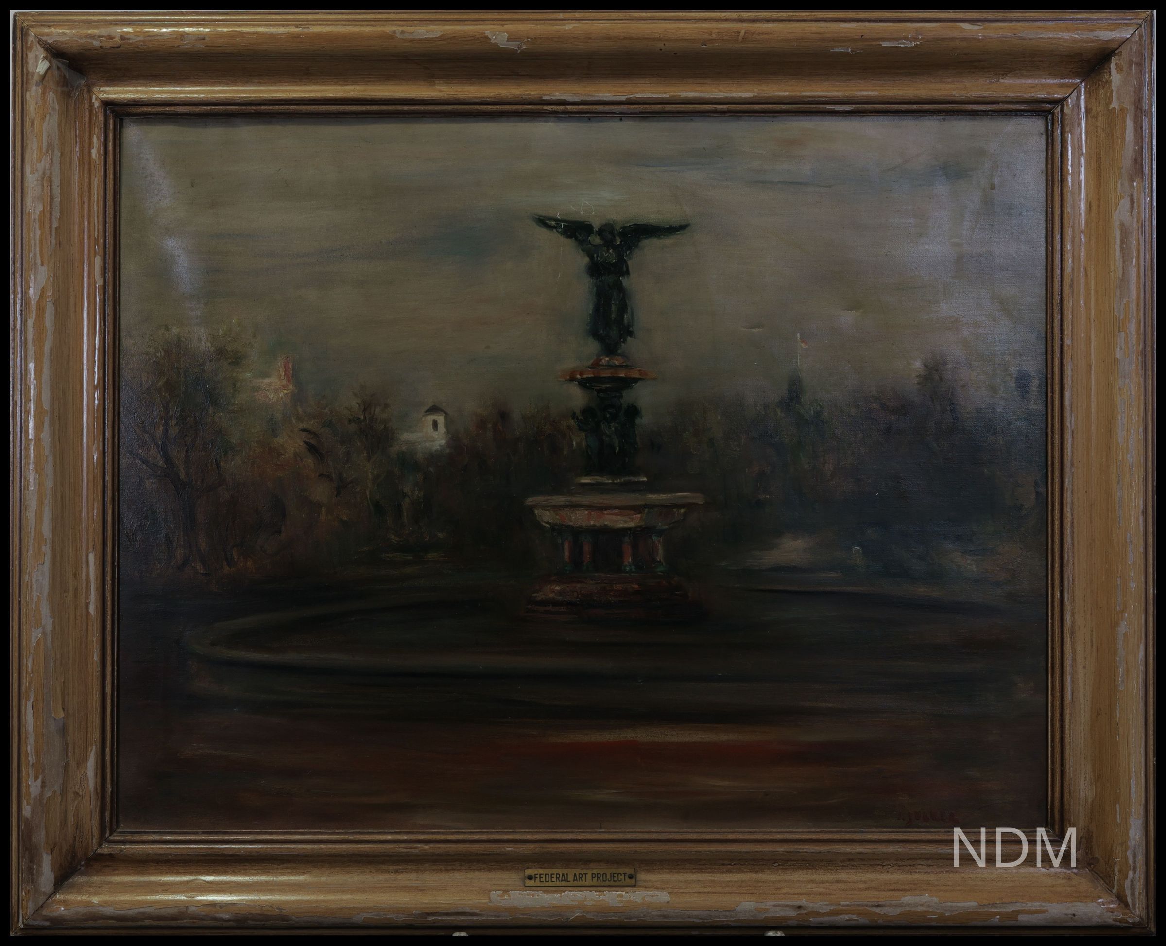 Depicted is the landmark Bethesda Fountain located in New York City's Central Park. The fountain is adorned by a bronze statue with small figures that appear to support the winged figure. Bethesda is a biblical reference to a pool that is believed to have had healing powers, so its use for a fountain's name has great significance. The warm colors and large brush strokes give this painting a sense of importance that is associated with being in Central Park--a location not far from Zucker's home in New York.Collection