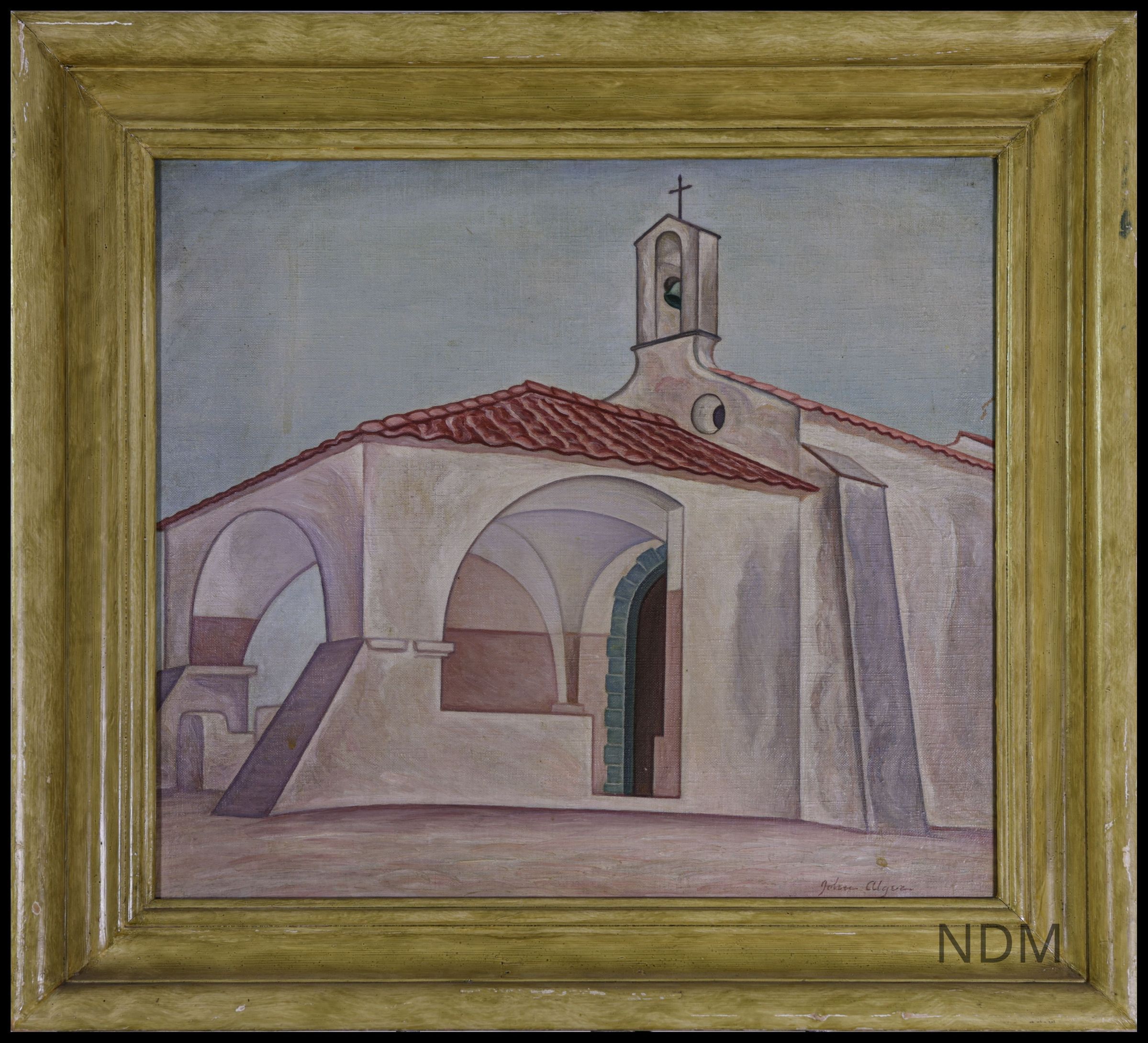 We see a small chapel with a terra cotta roof and a small bell. The only spots of color are the red roof tiles and the teal of bricks around the door. The rest of the painting is bleached, faded to hues of pale beige and blue. The door inside, framed by both the only vibrant blue in the painting, and by the circular arch of the chapel's portico, is made the focus of the painting.Collection